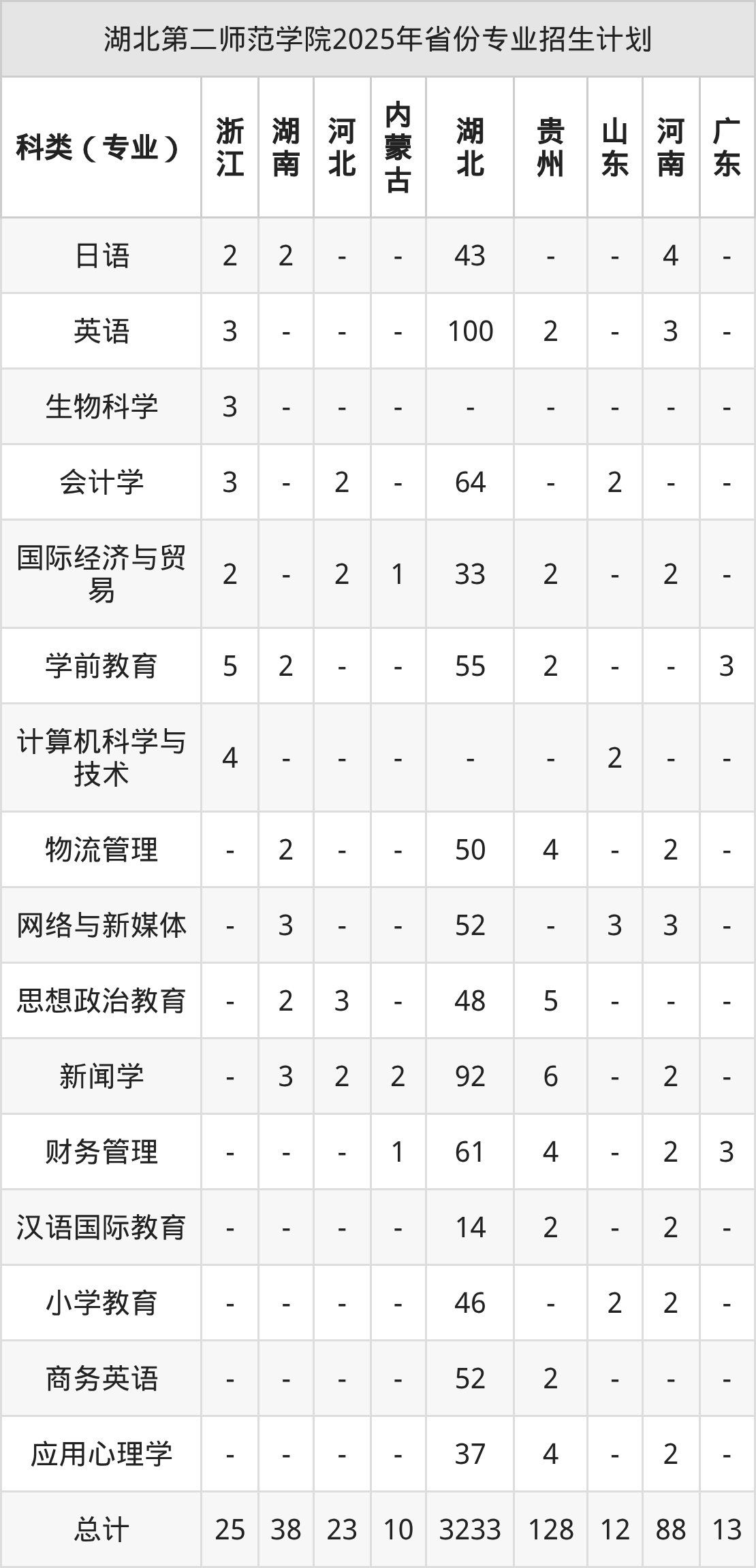 而各省份的招生计划数为湖北3233人,贵州128人,福建15人,江西64人,江苏30人等。