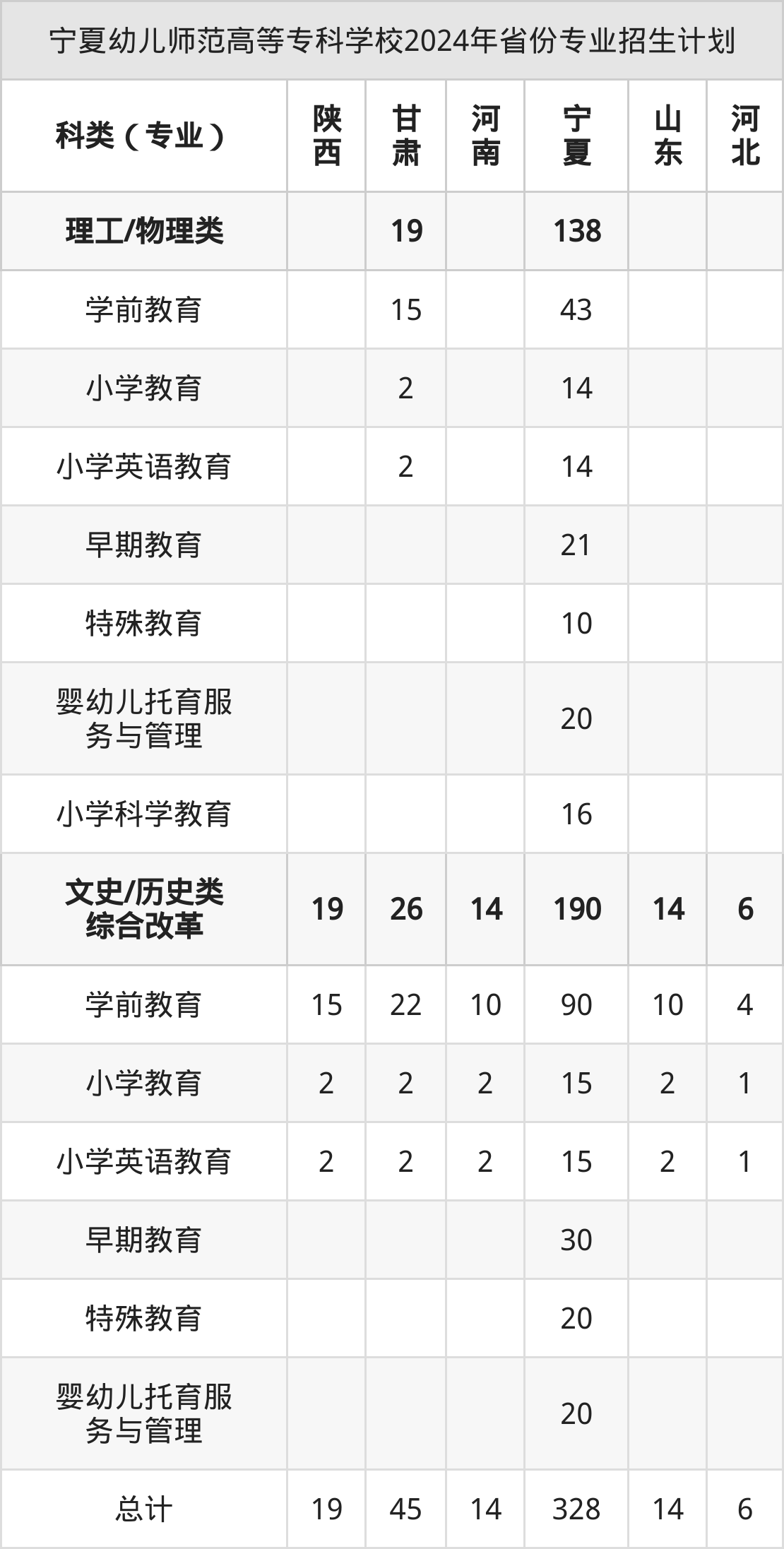 而各省份的招生计划数为宁夏328人,山东14人,河北6人,陕西19人,甘肃45人等。