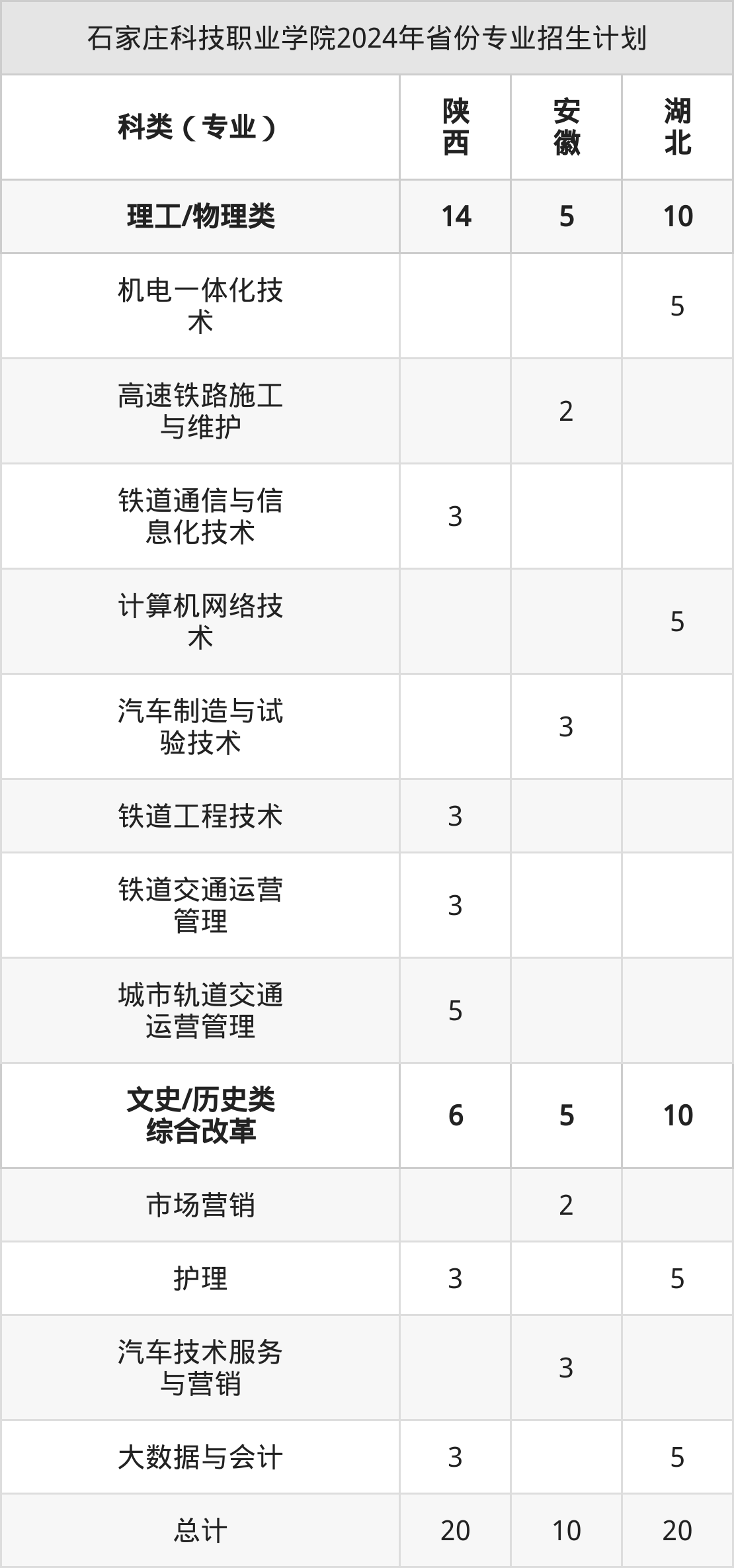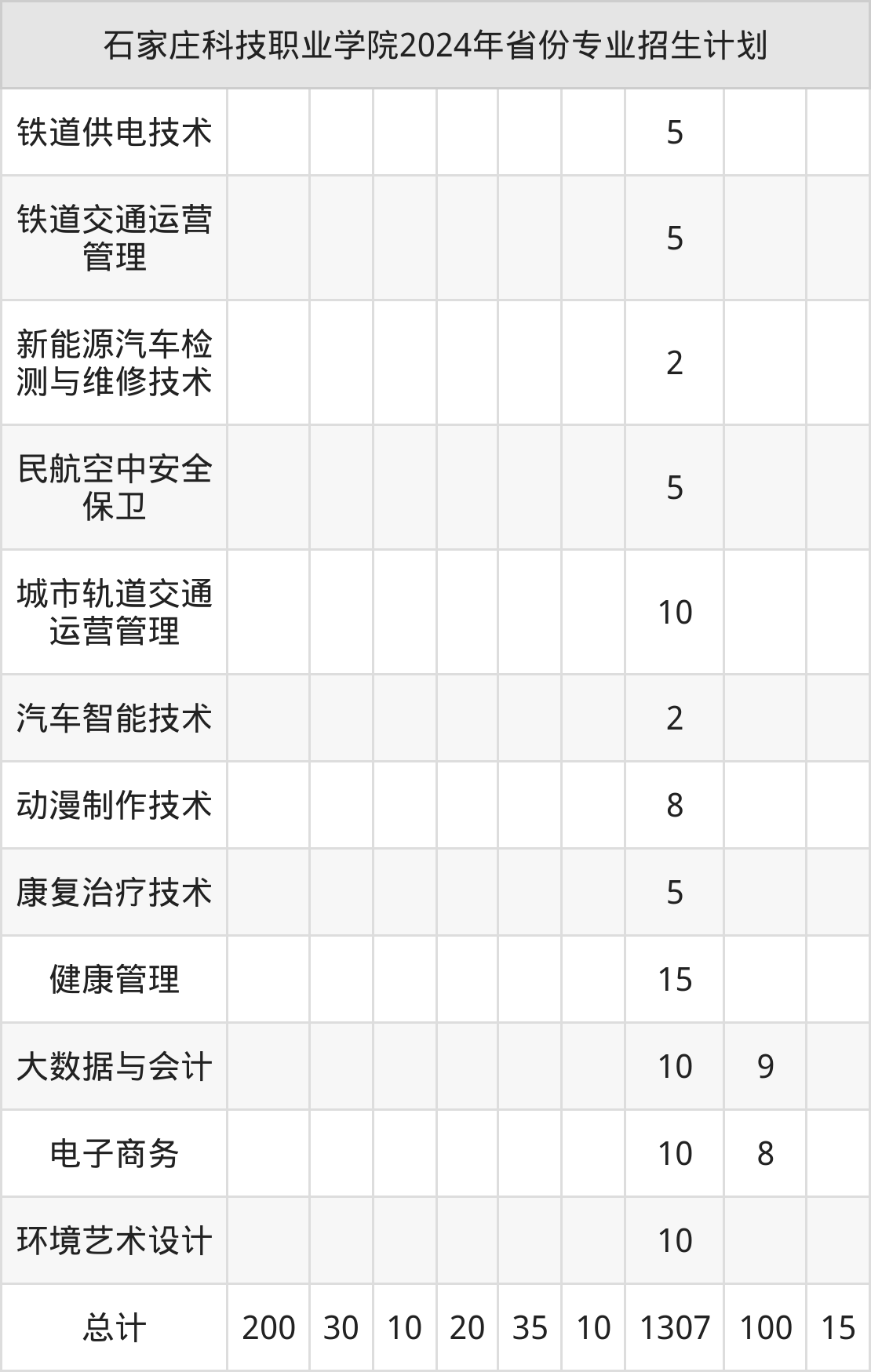 2024年石家庄科技职业学院计划招收专科生1777人,其中铁道车辆技术专业35人,动漫制作技术专业38人,机电一体化技术专业34人,大数据与财务管理专业41人,工程造价专业41人等。