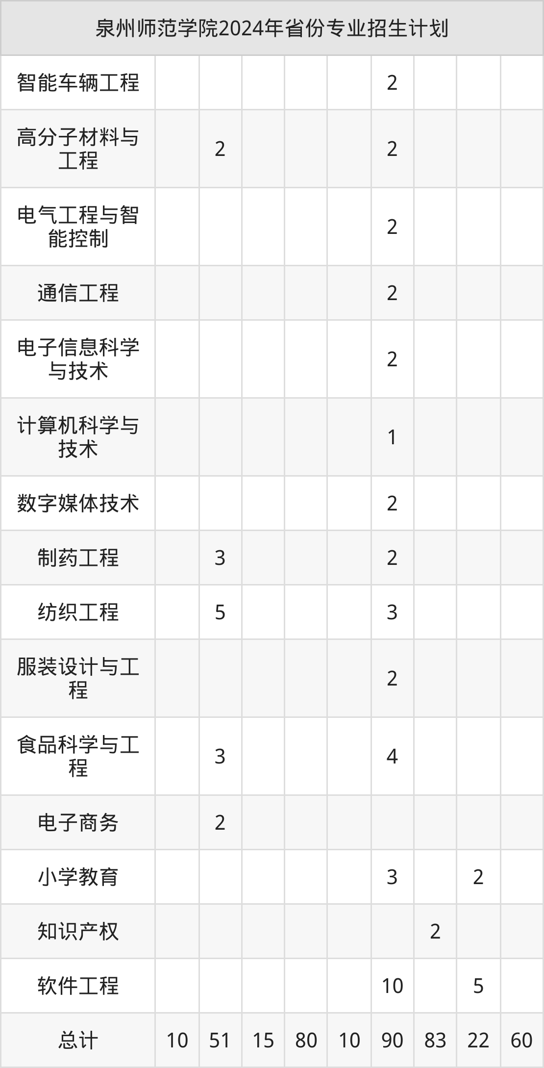 2024年泉州师范学院计划招收本科生1852人,其中高分子材料与工程专业60人,计算机科学与技术专业31人,软件工程专业36人,数学与应用数学专业46人,英语专业74人等。