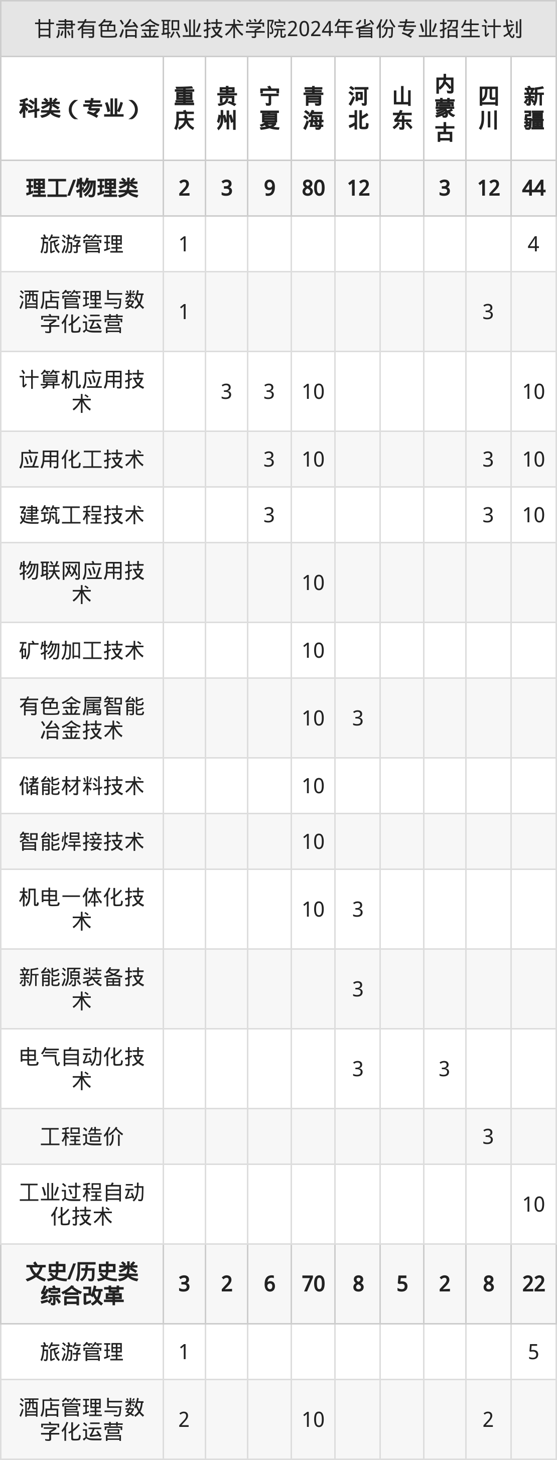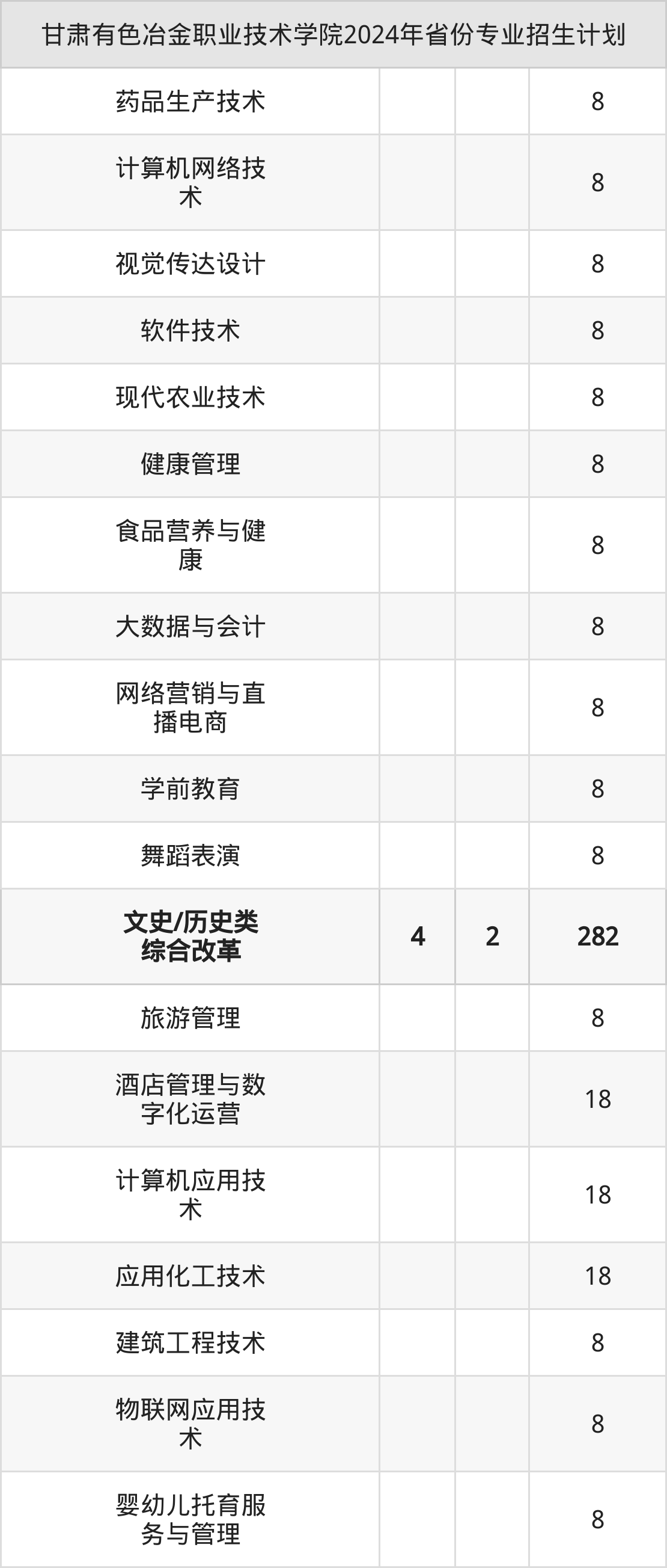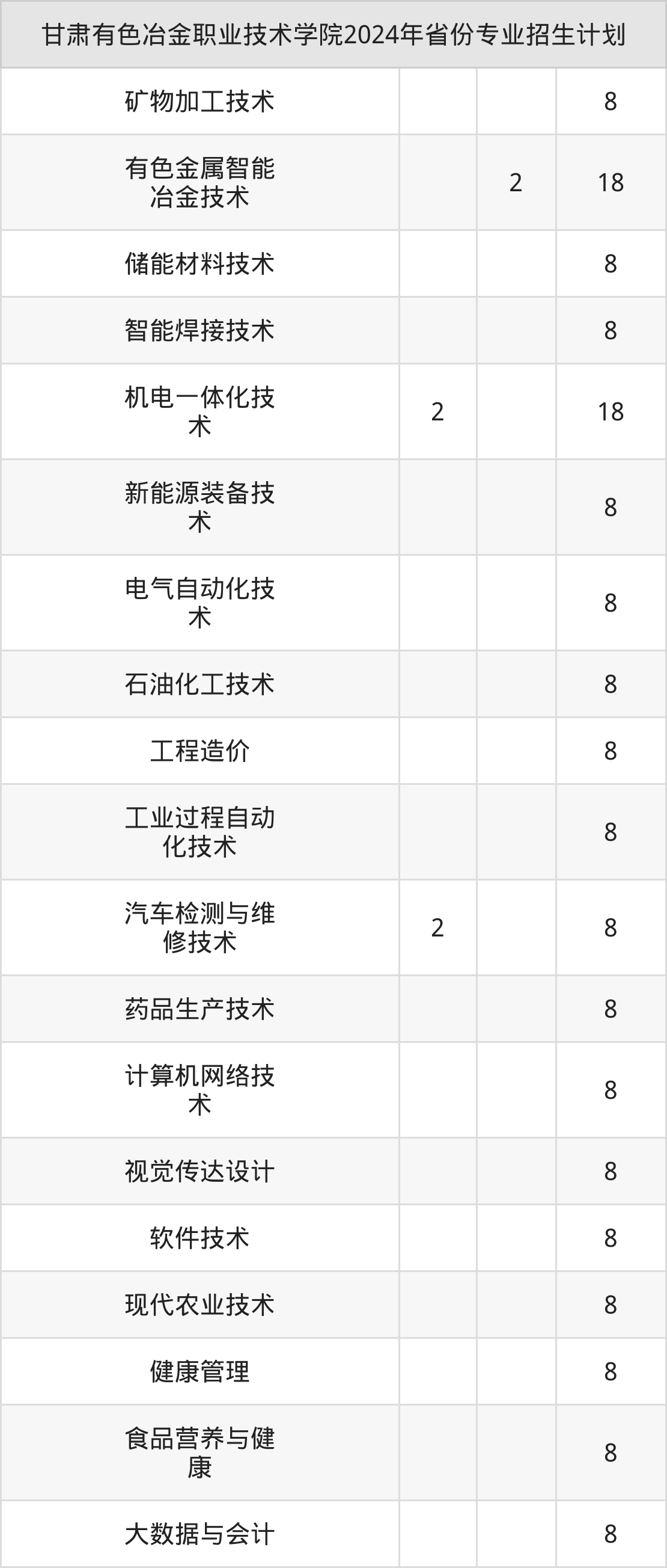 2025年甘肃有色冶金职业技术学院专科招生计划待公布,下面附上2024年数据,暂供参考: