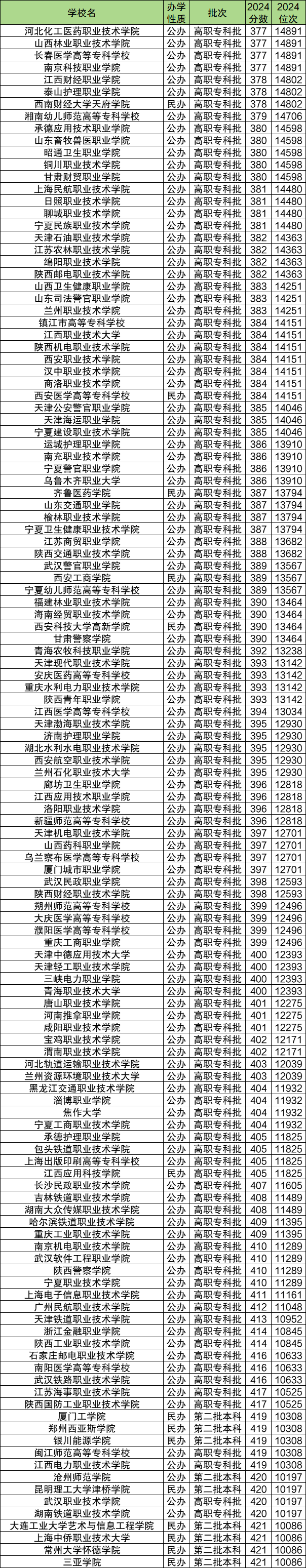 1万-1.5万名中最低位次对应的大学有河北化工医药职业技术学院、山西林业职业技术学院等4所,最低录取位次为14891位,位次对应分数为377分。