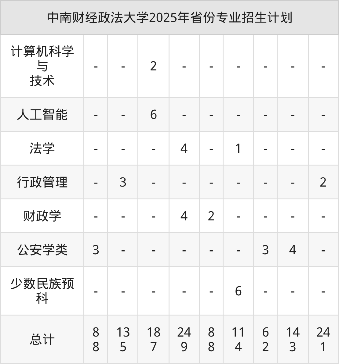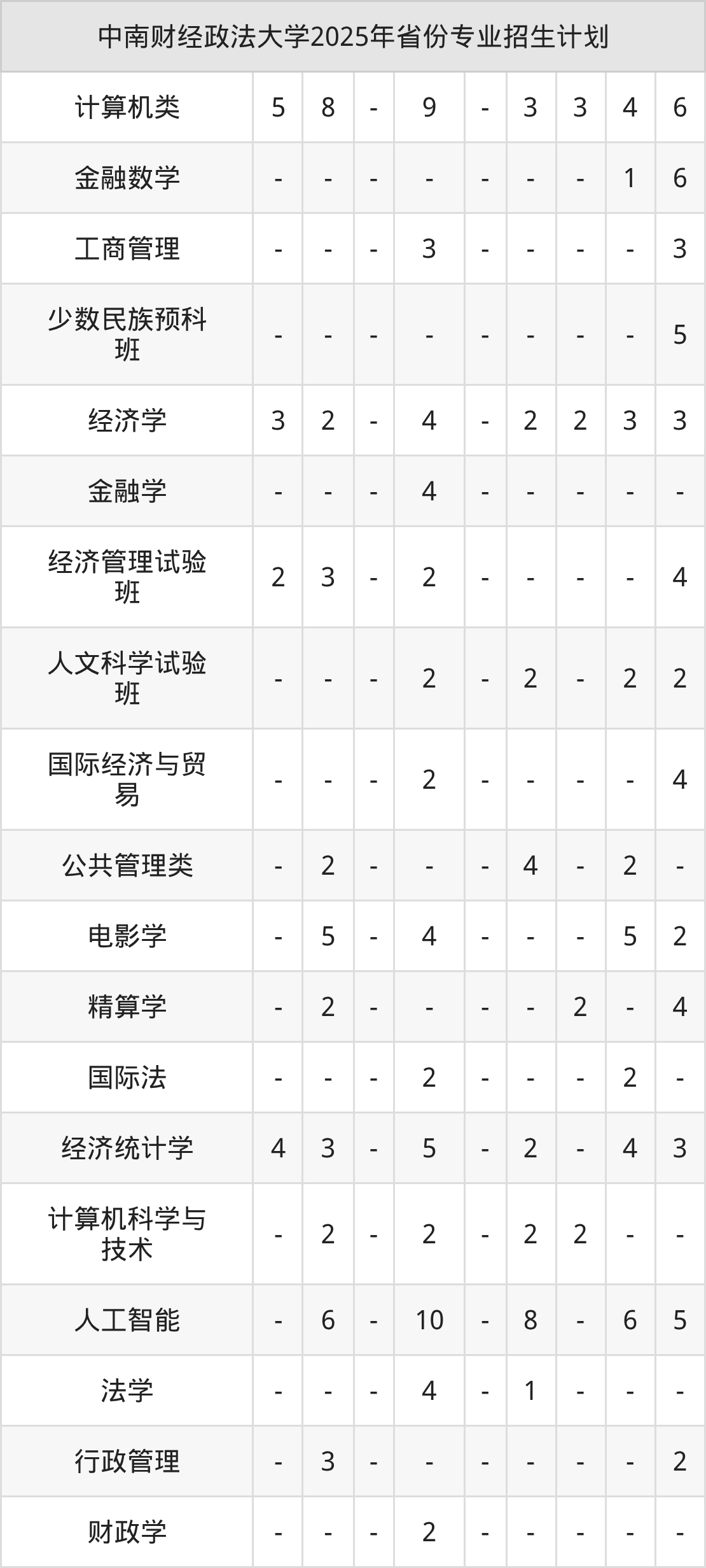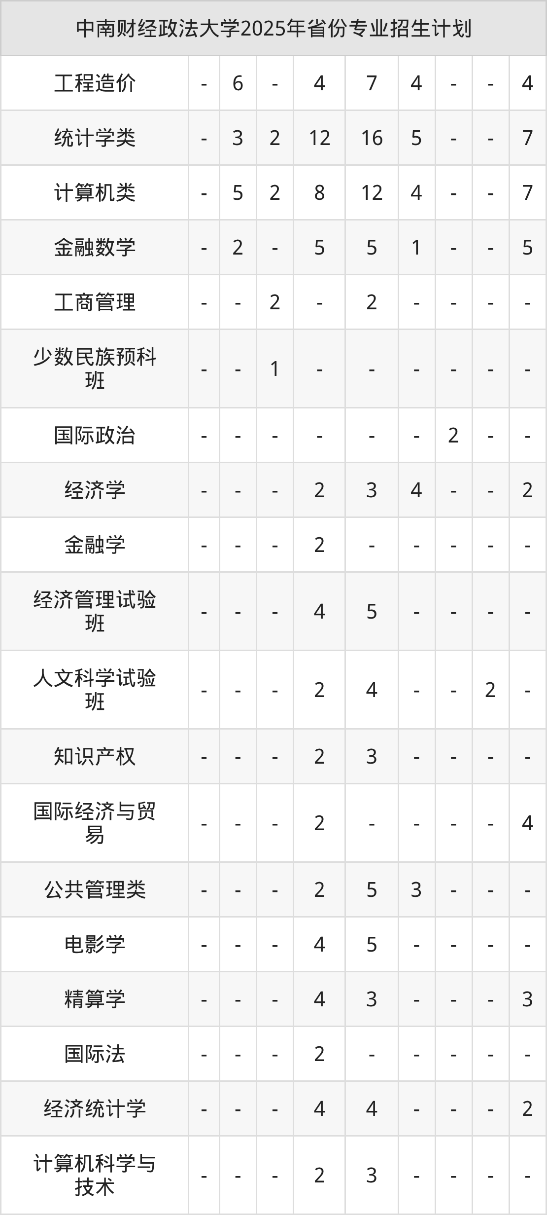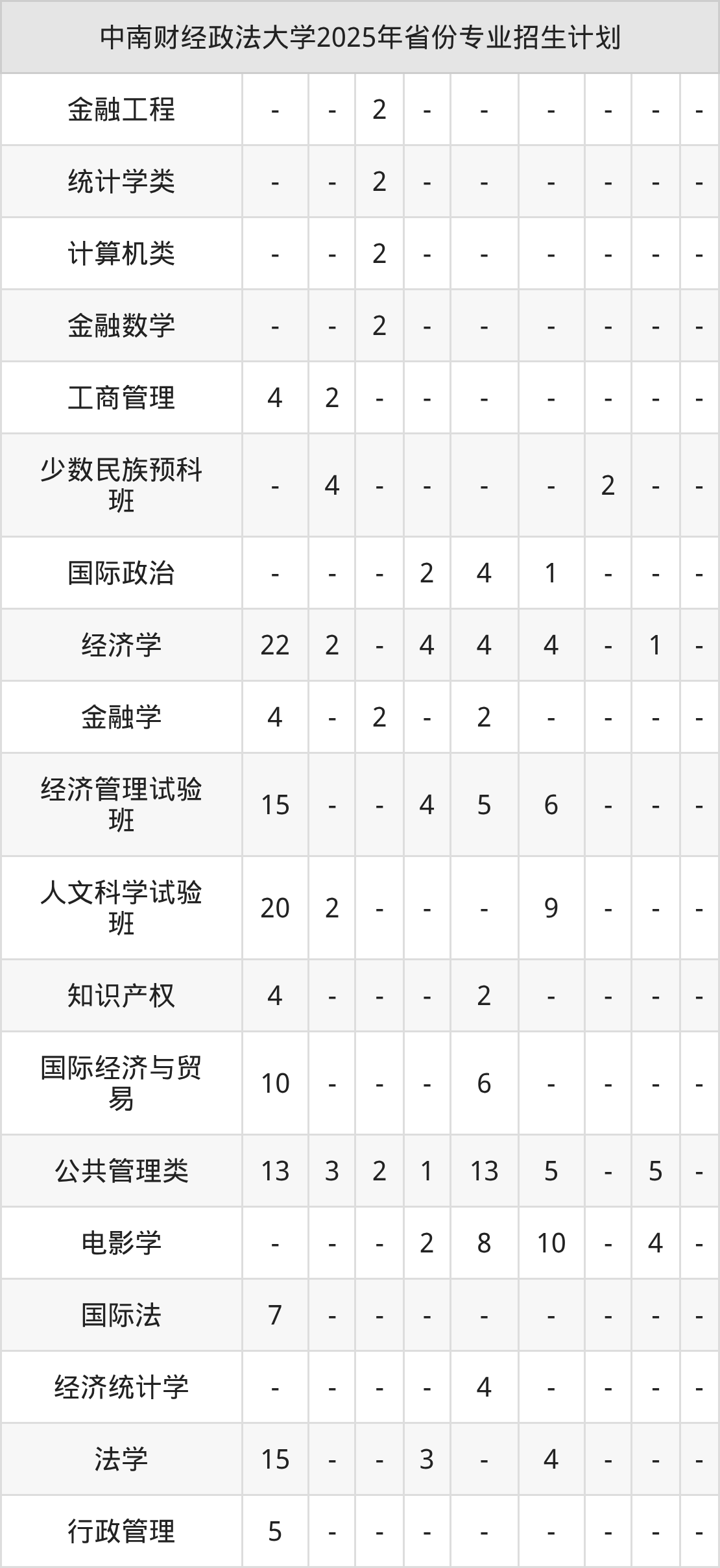 2025年中南财经政法大学计划招收本科生4447人,其中财政学类专业193人,统计学类专业185人,计算机类专业169人,少数民族预科班专业24人,精算学专业48人等。