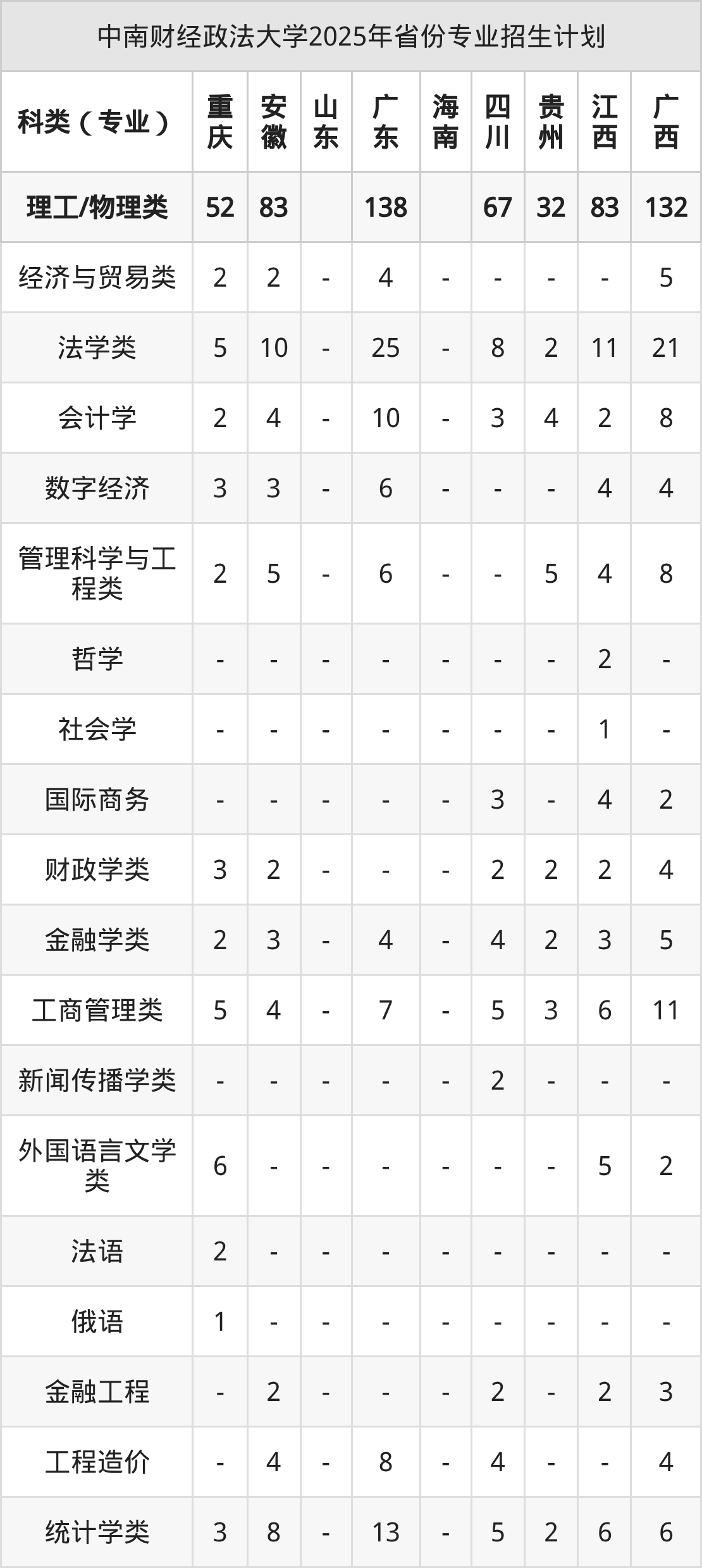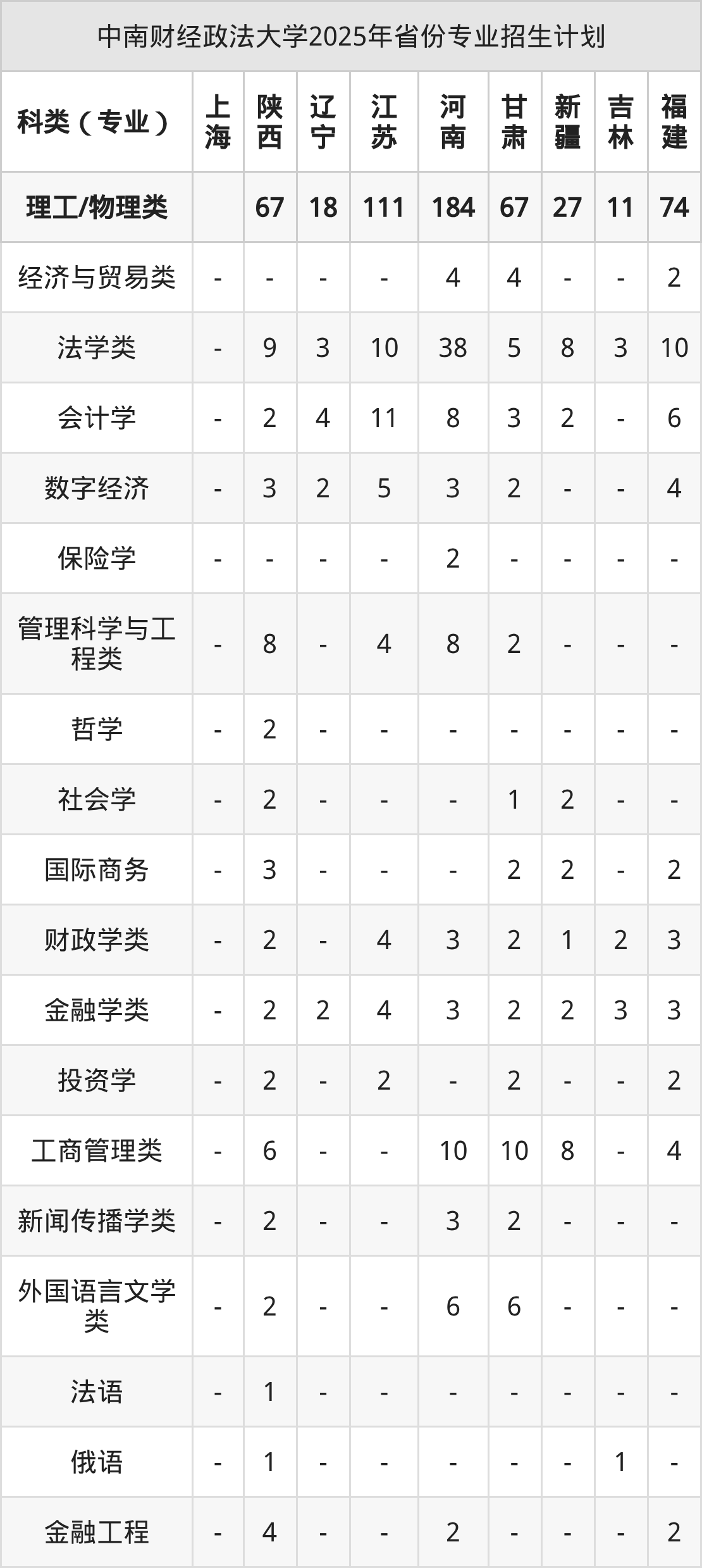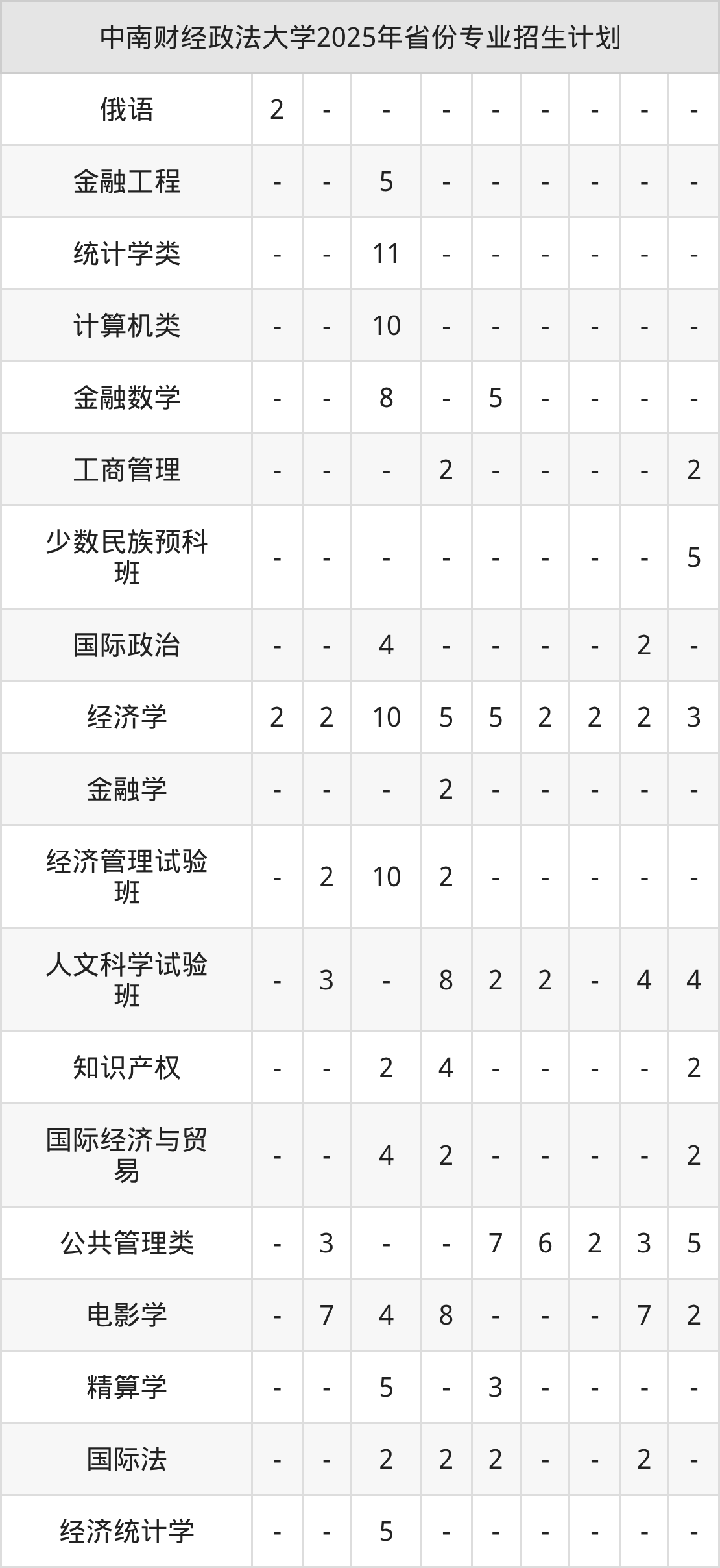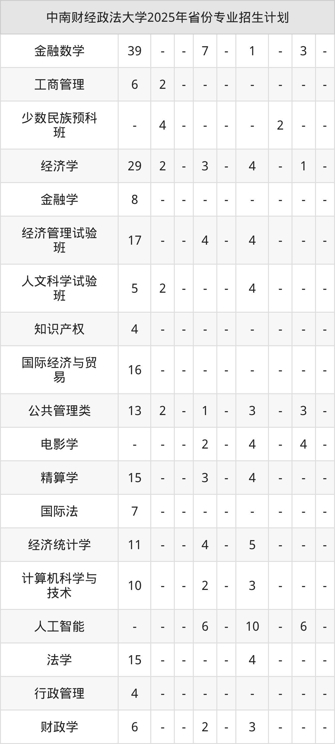 2025年中南财经政法大学计划招收本科生4447人,其中财政学类专业193人,统计学类专业185人,计算机类专业169人,少数民族预科班专业24人,精算学专业48人等。