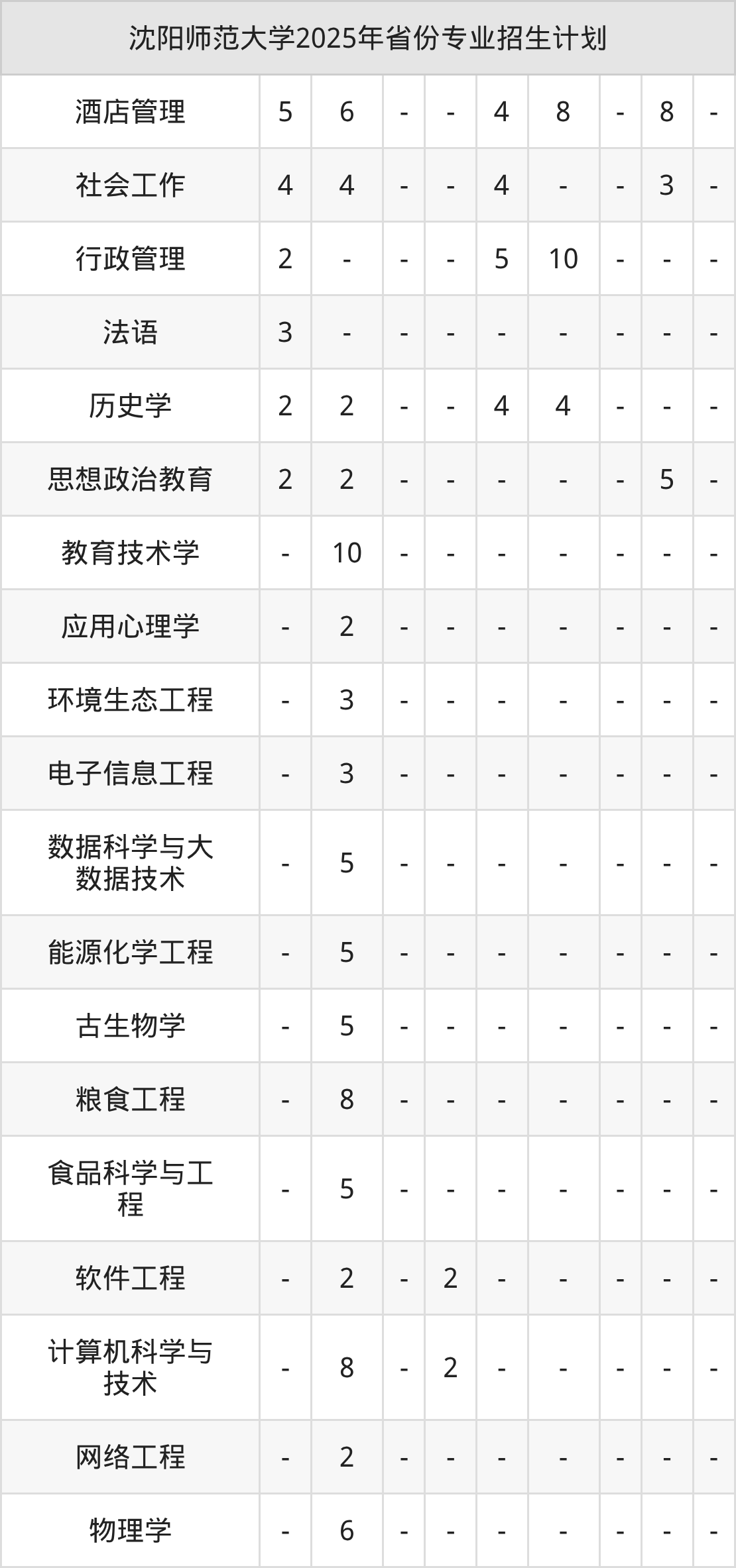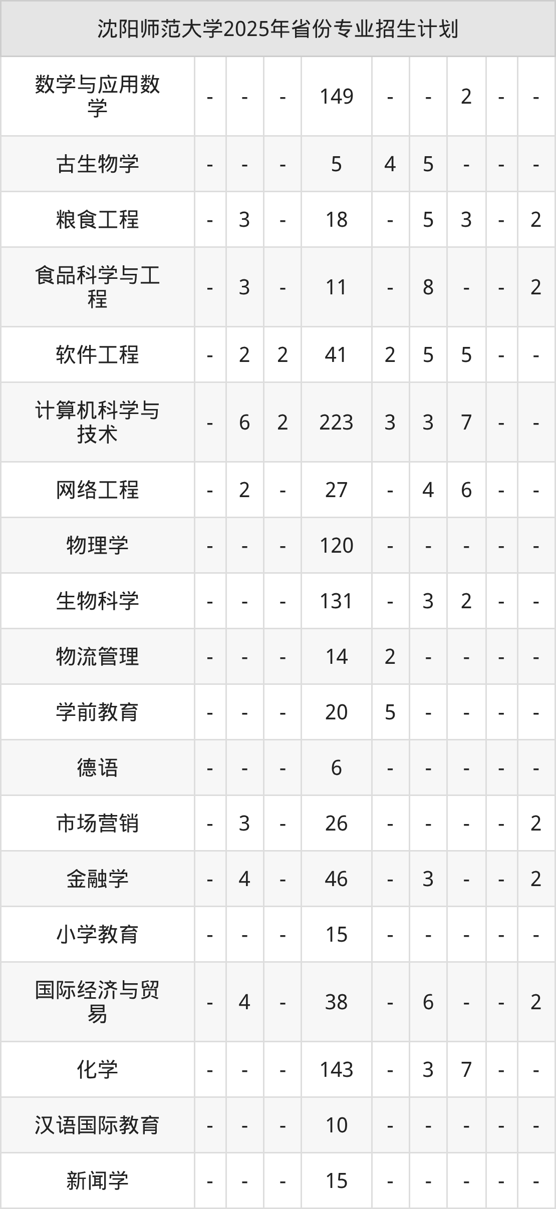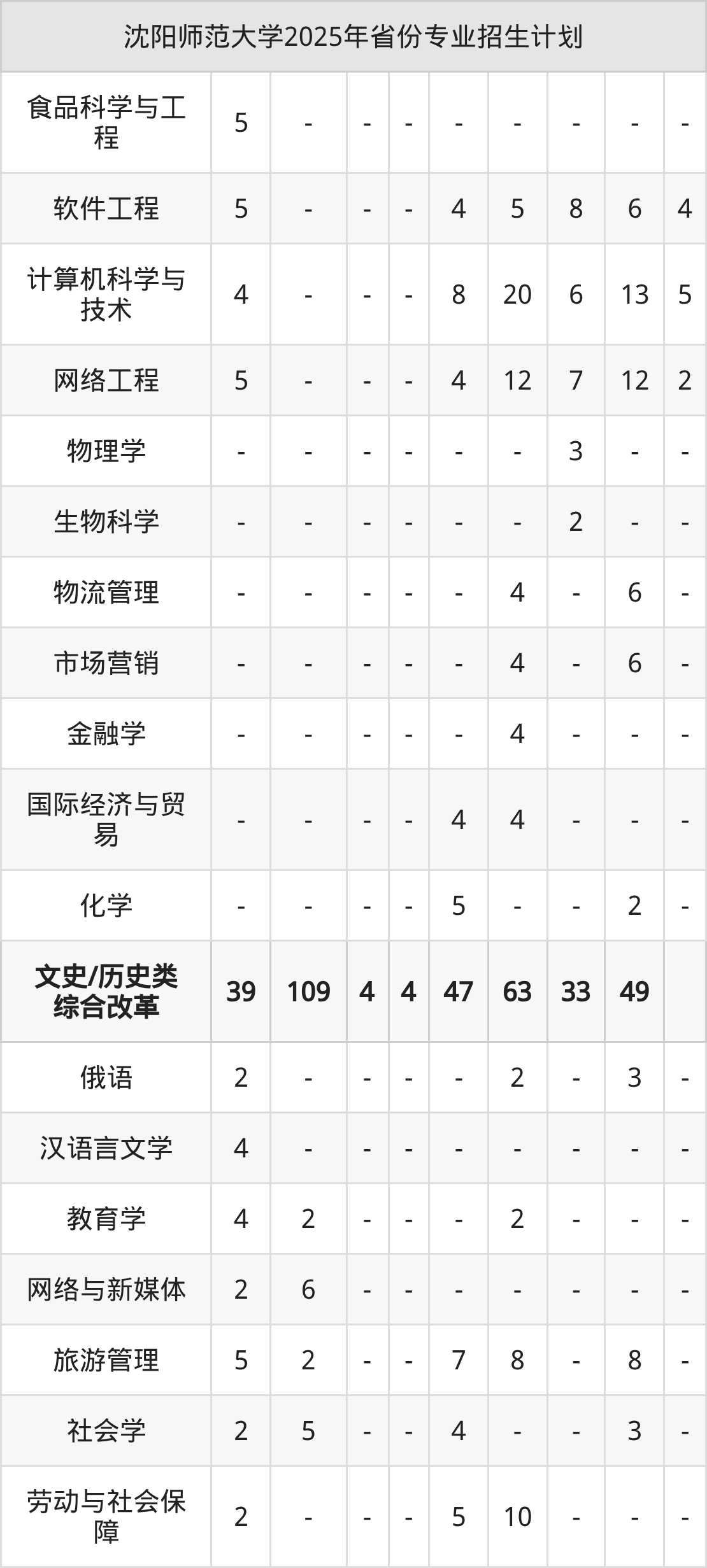 2025年沈阳师范大学计划招收本科生3800人,其中教育学专业50人,历史学专业60人,能源化学工程专业90人,计算机科学与技术专业379人,网络工程专业94人等。