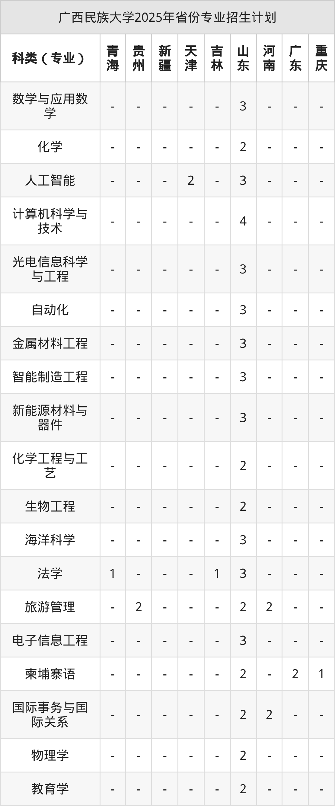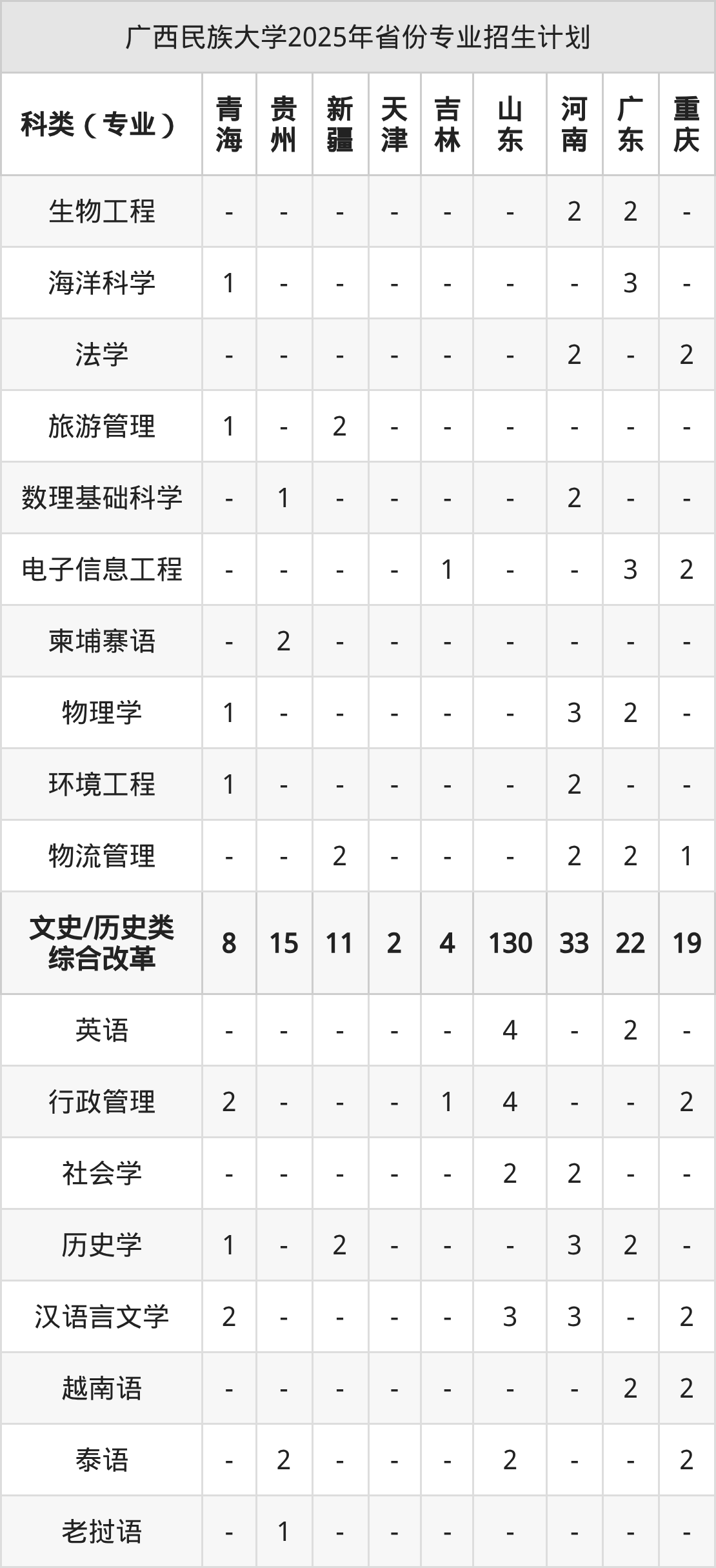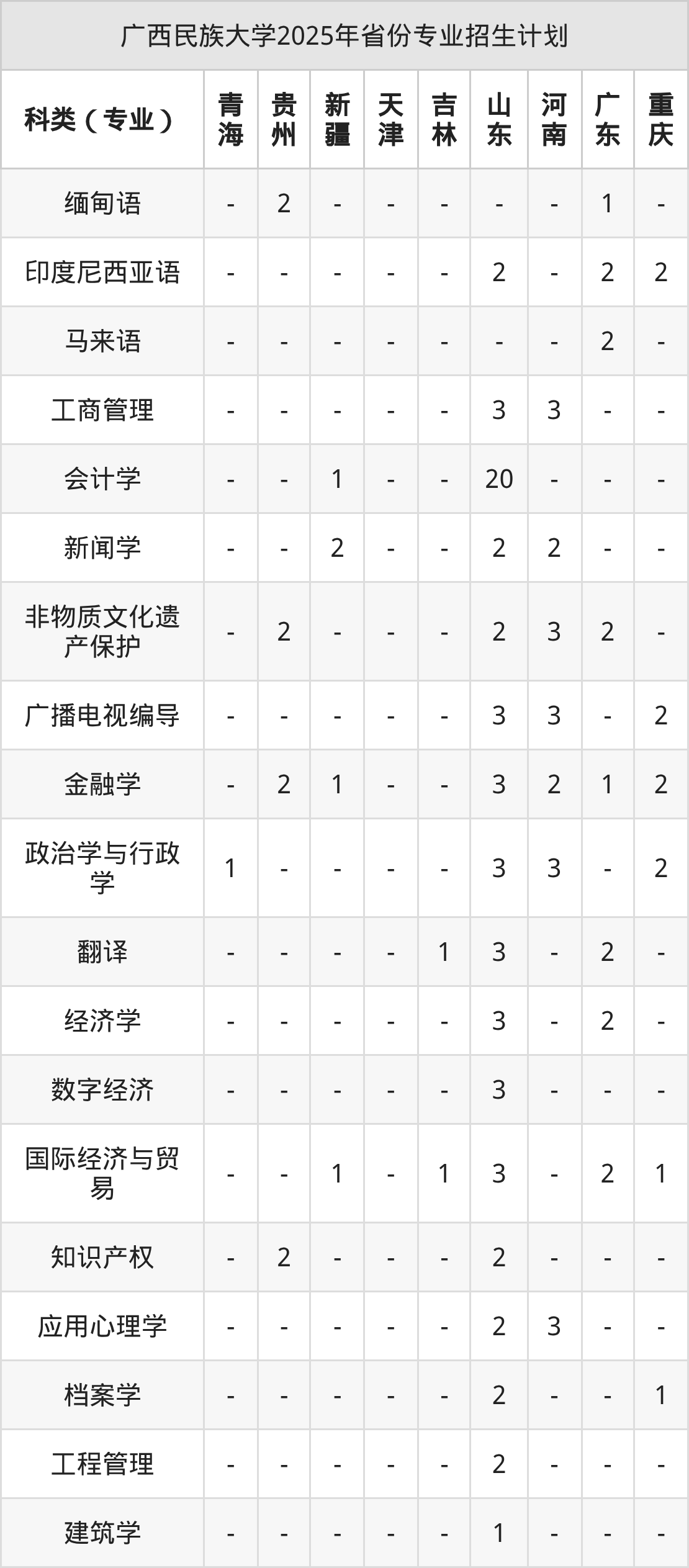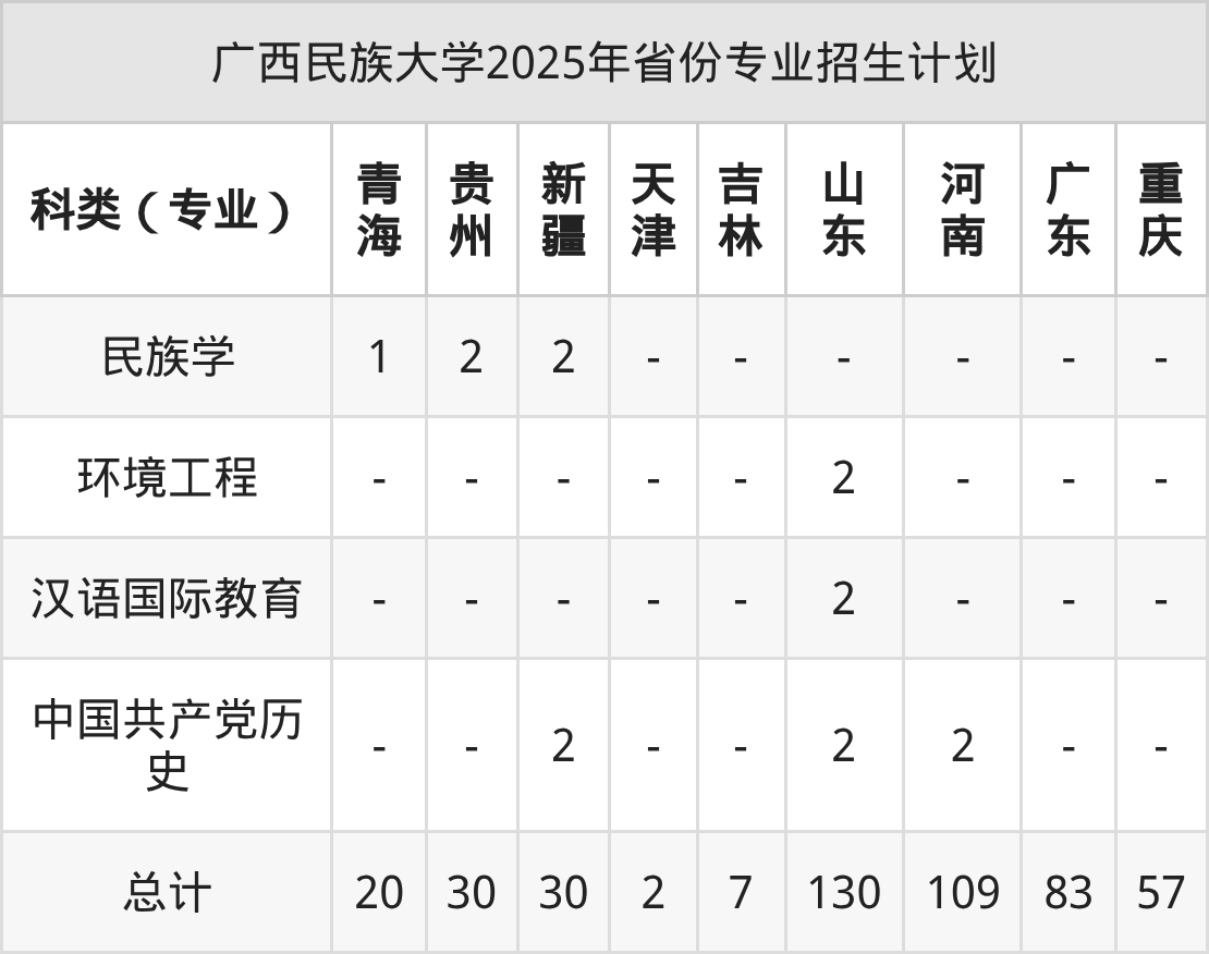 而各省份的招生计划数为山东130人,广东83人,福建29人,广西6113人,青海20人等。