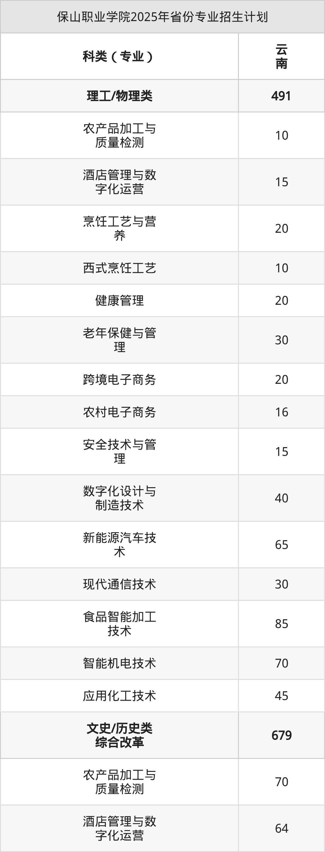 2026年保山职业学院专科招生计划待公布,下面附上2025年数据,暂供参考: