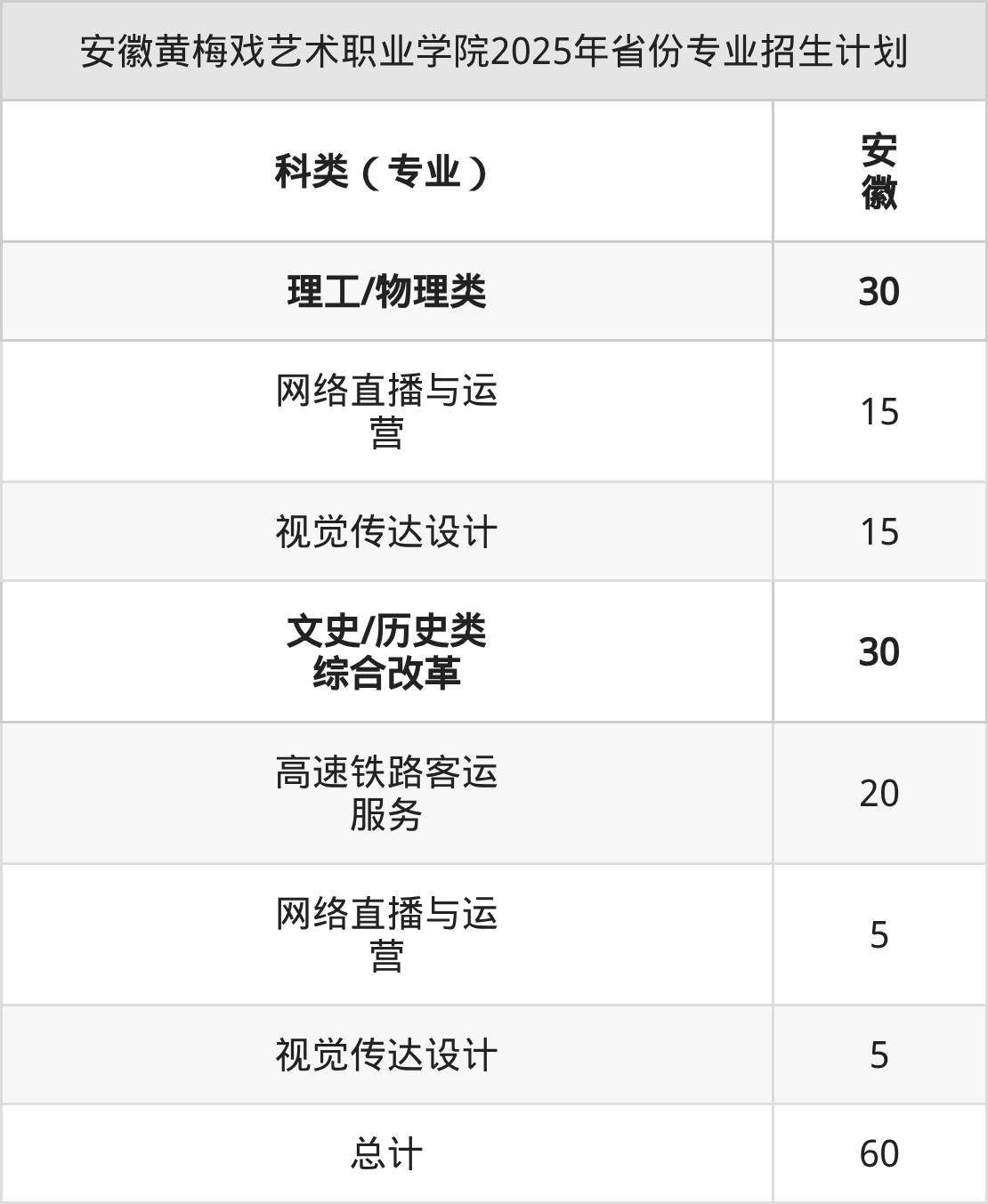 2025年安徽黄梅戏艺术职业学院计划招收专科生60人,其中高速铁路客运服务专业20人,网络直播与运营专业20人,视觉传达设计专业20人。