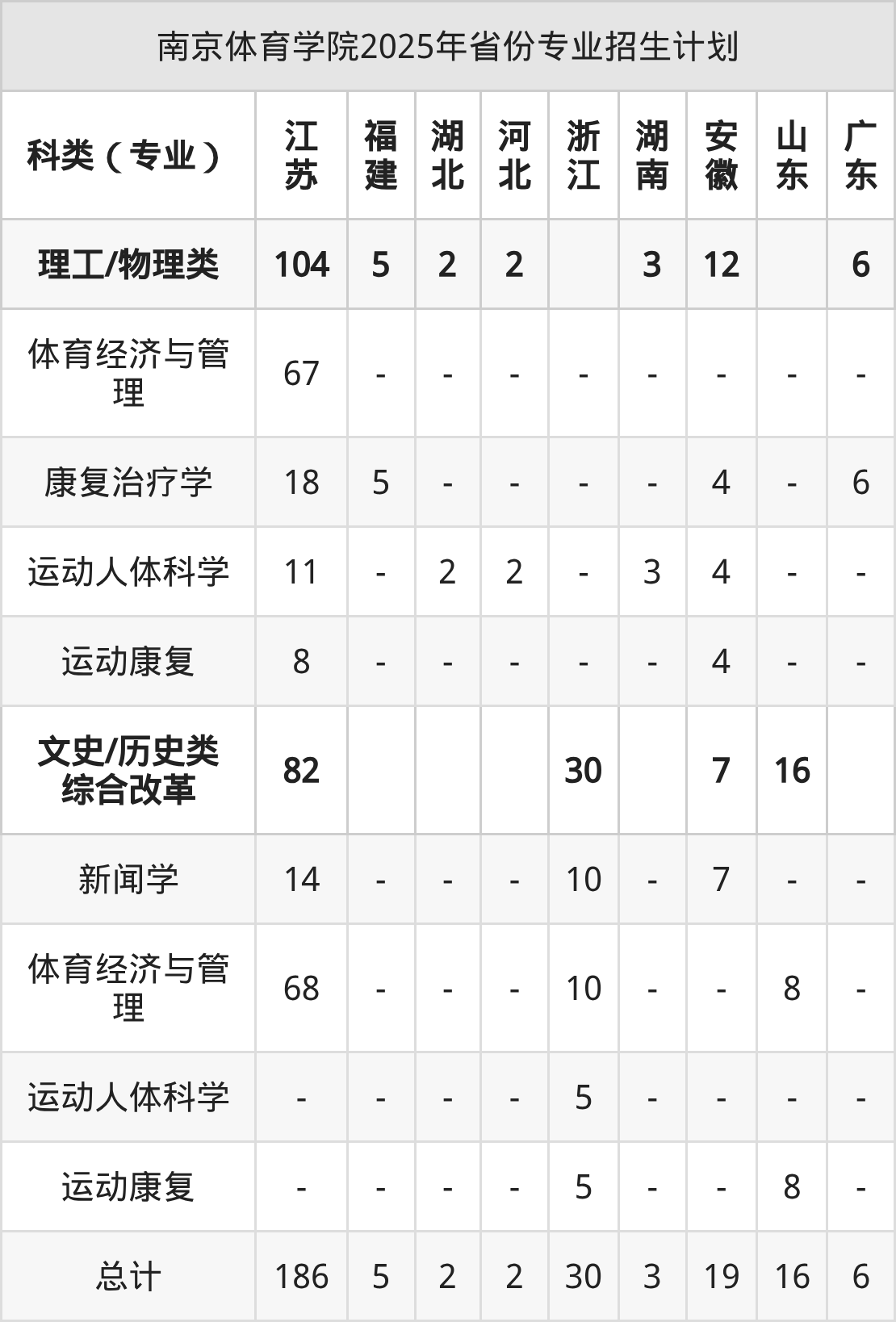 而各省份的招生计划数为山东16人,江苏186人,湖北2人,河北2人,安徽19人等。