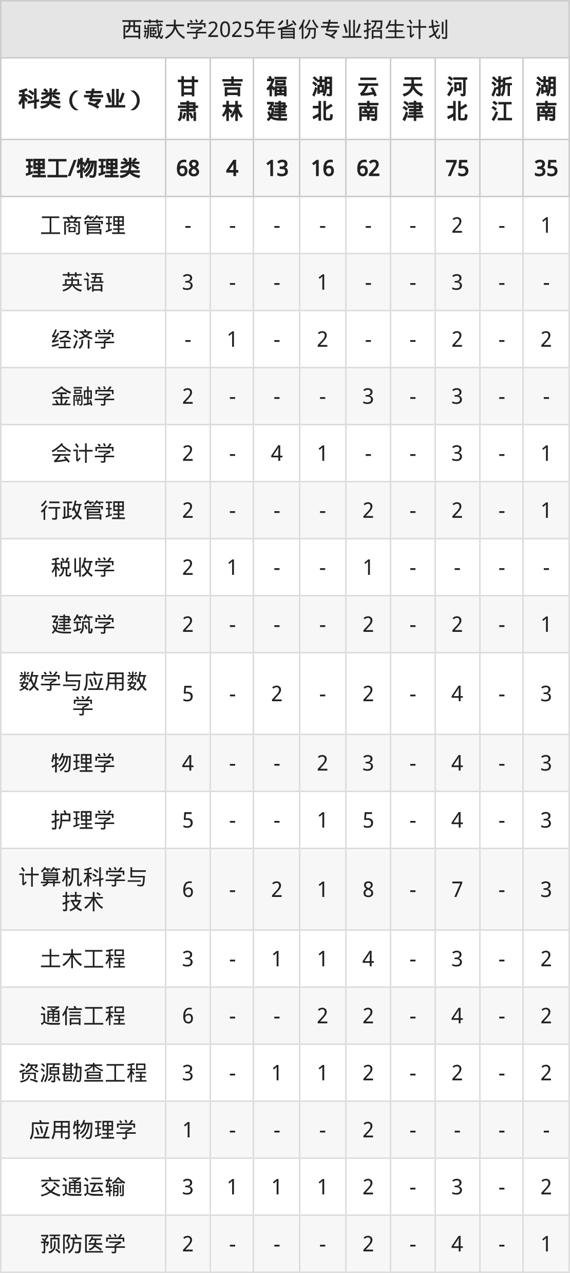 2025年西藏大学计划招收本科生1065人,其中历史学专业15人,建筑学专业20人,物理学专业42人,会计学专业35人,数学与应用数学专业41人等。