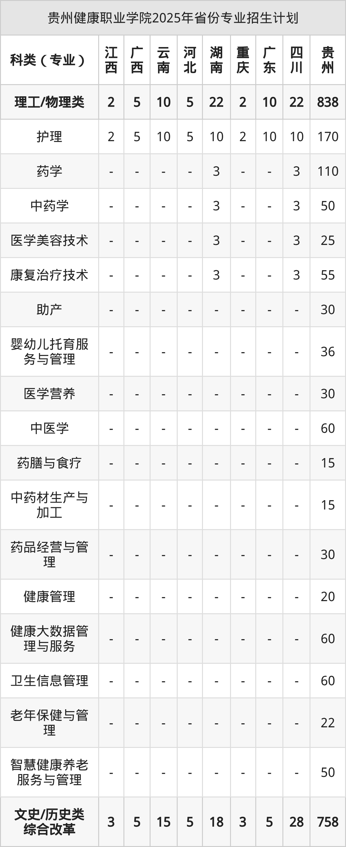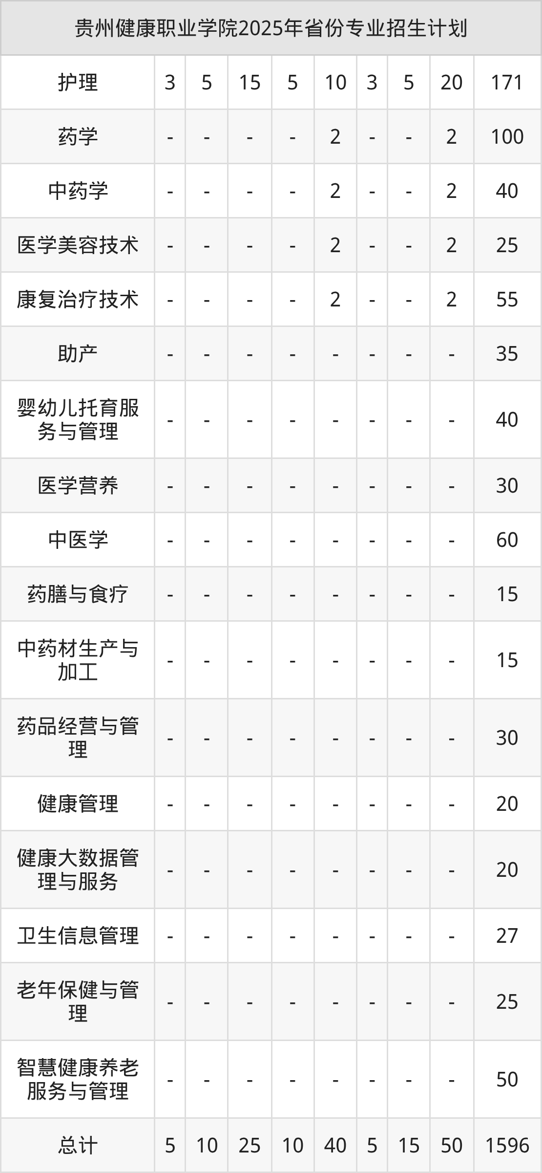2026年贵州健康职业学院专科招生计划待公布,下面附上2025年数据,暂供参考: