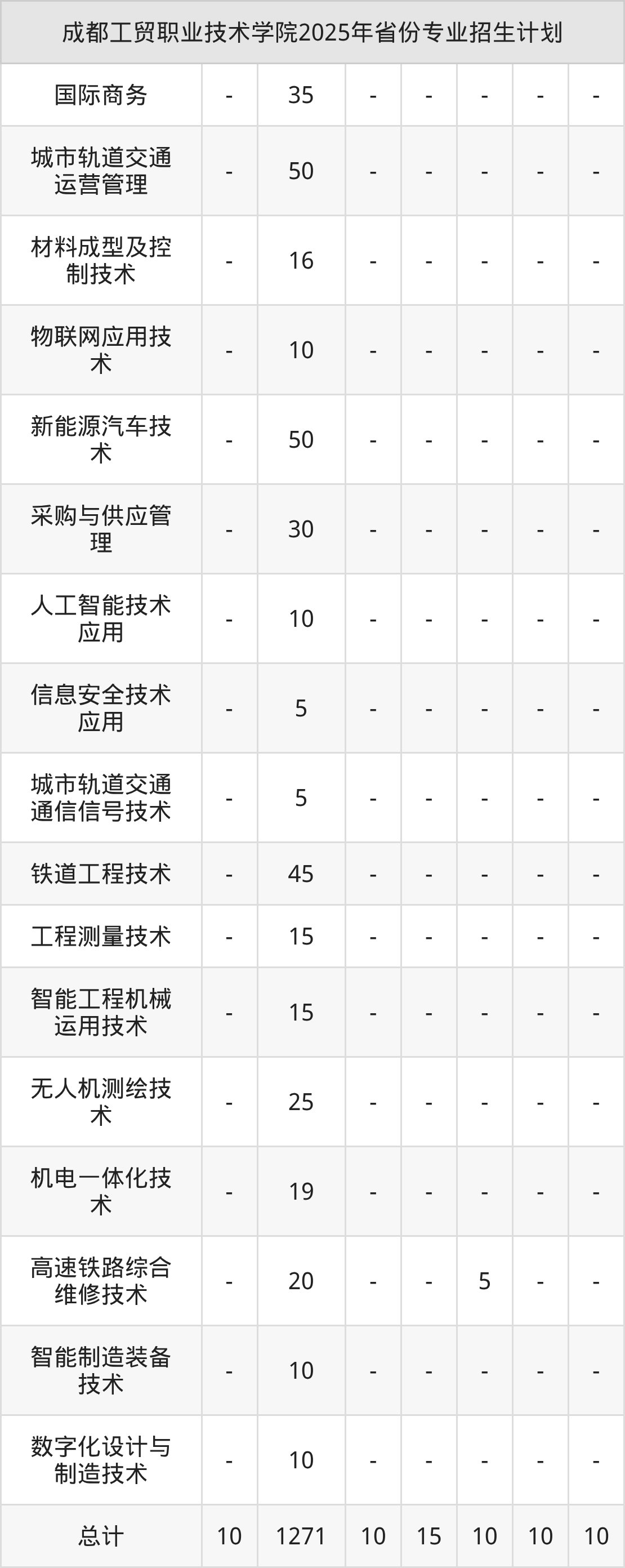 2025年成都工贸职业技术学院计划招收专科生1336人,其中人工智能技术应用专业35人,智能工程机械运用技术专业30人,高速铁路综合维修技术专业50人,数字化设计与制造技术专业40人,航空发动机制造技术专业40人等。