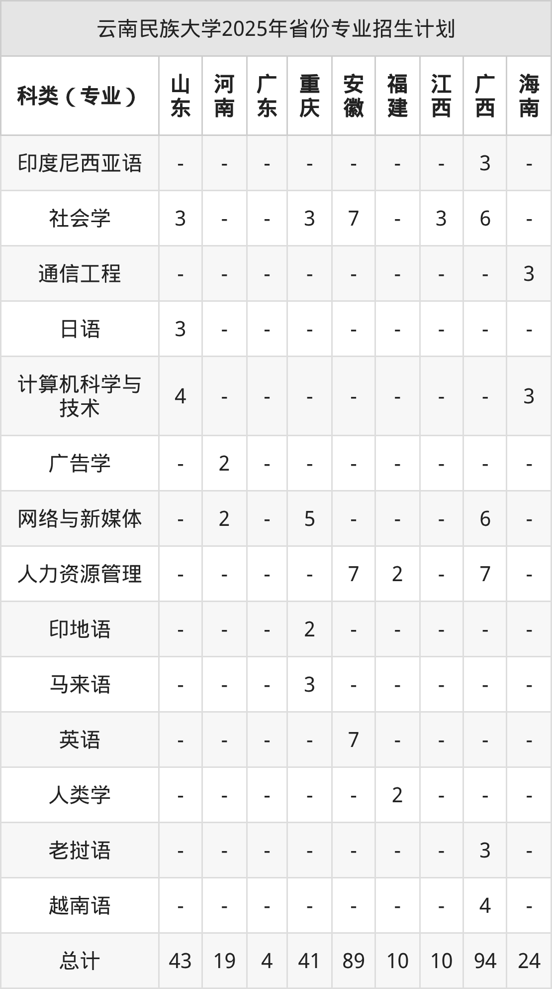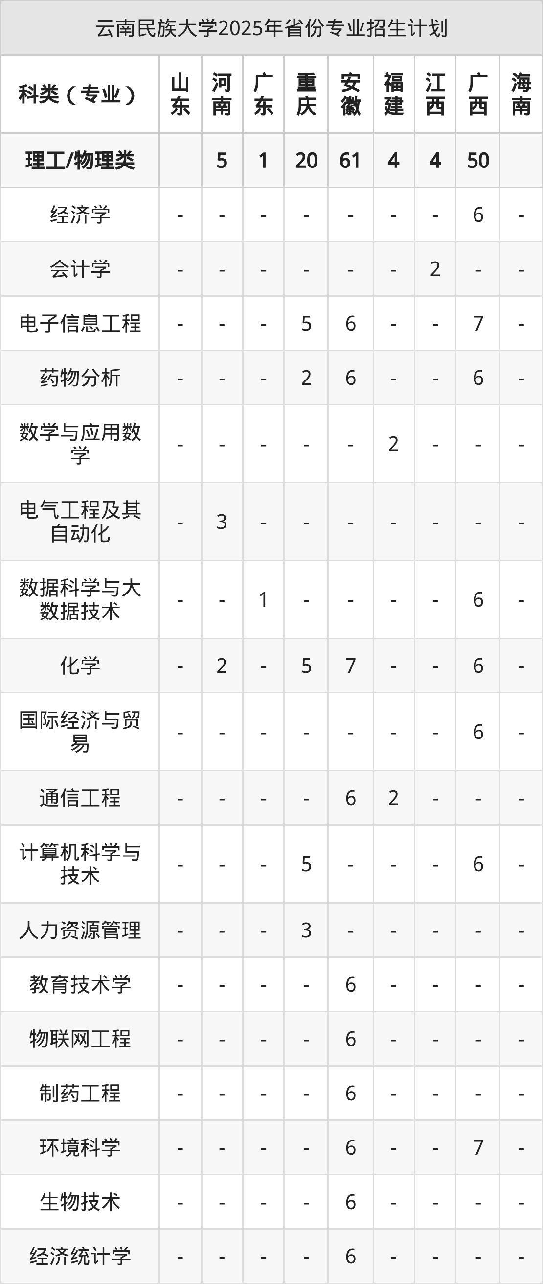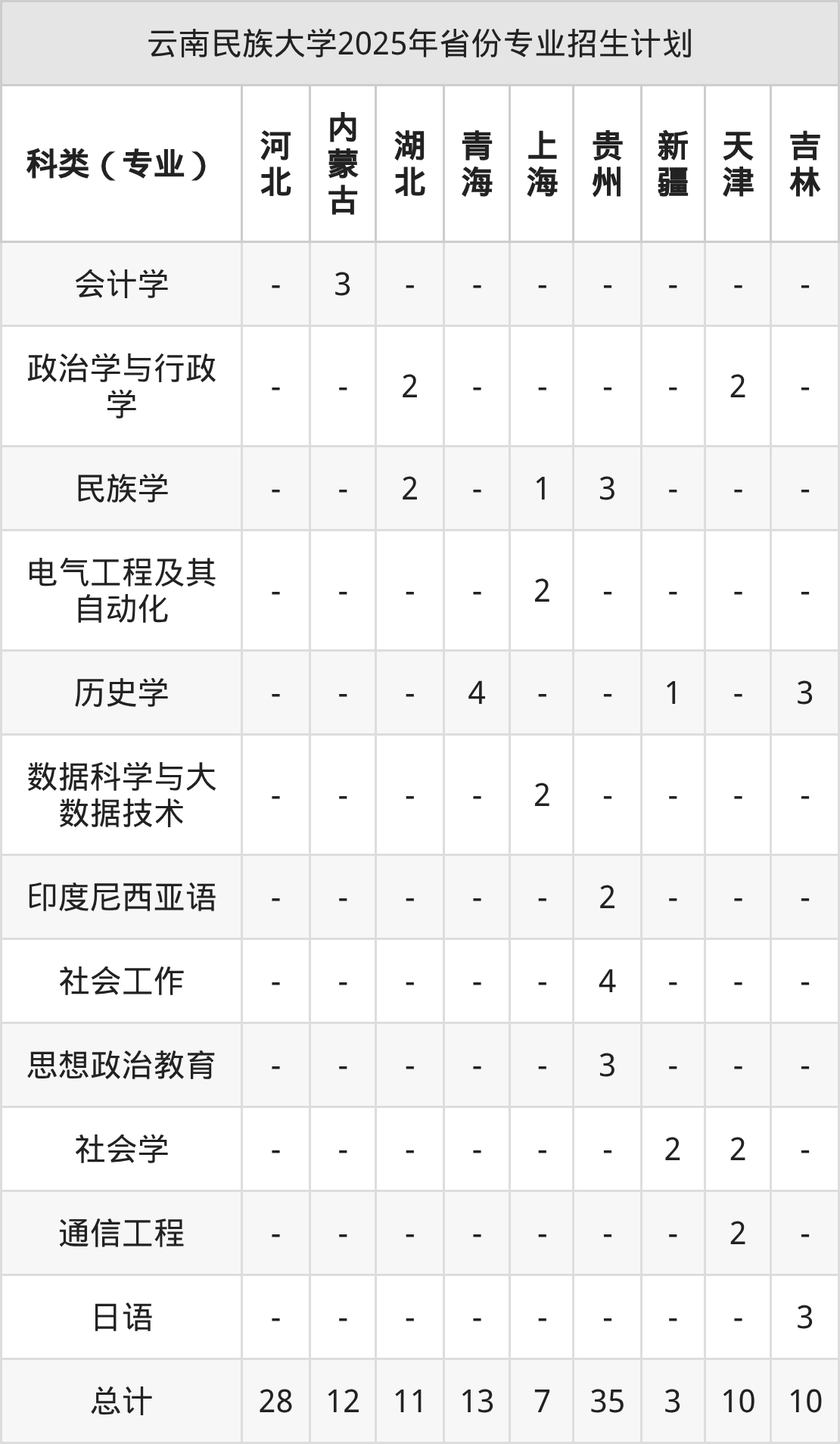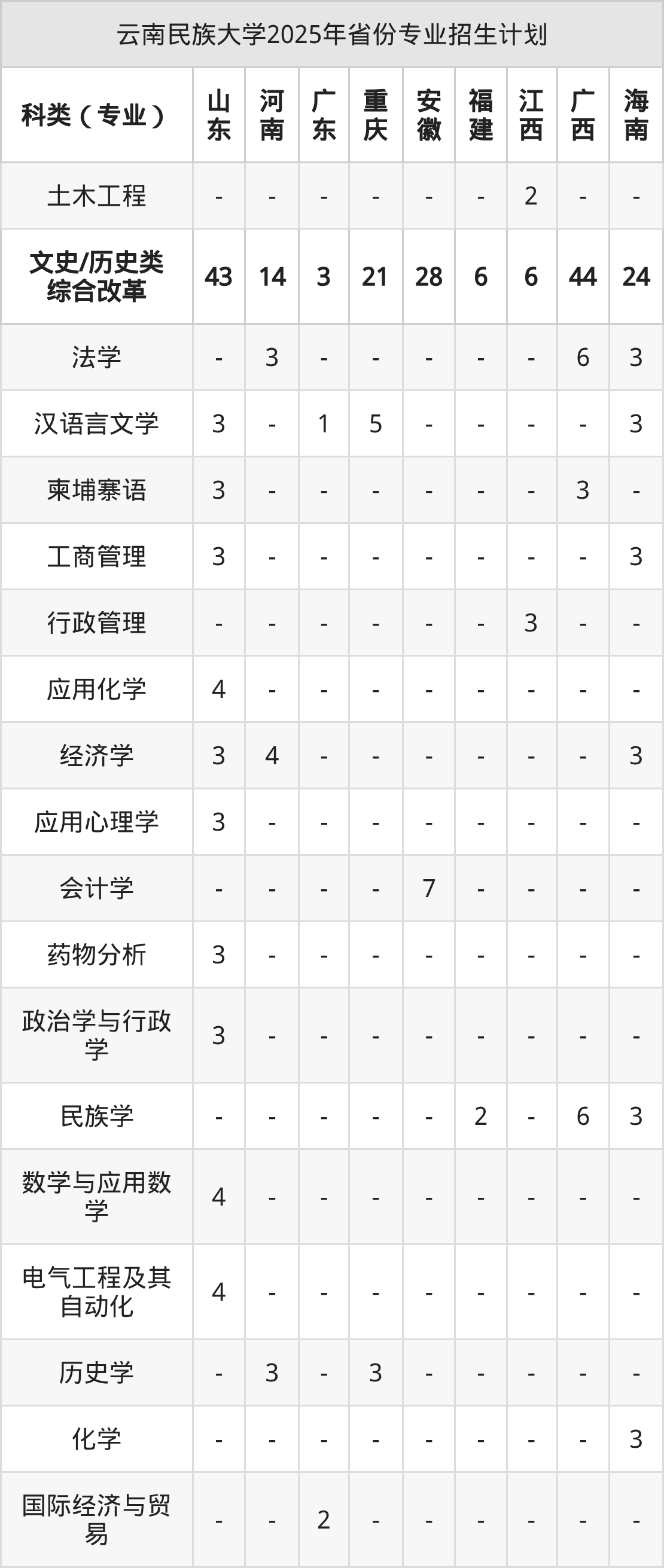 而各省份的招生计划数为福建10人,浙江39人,贵州35人,山东43人,湖南18人等。