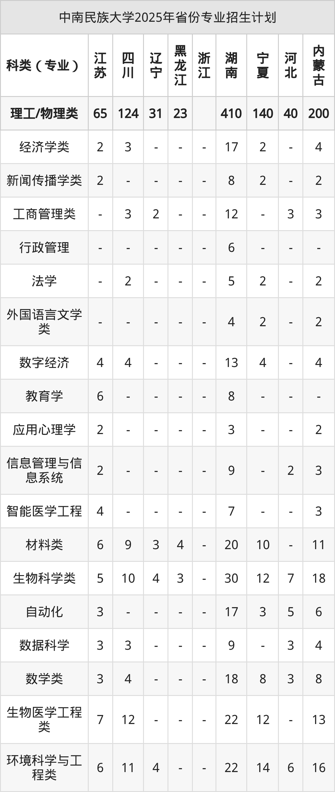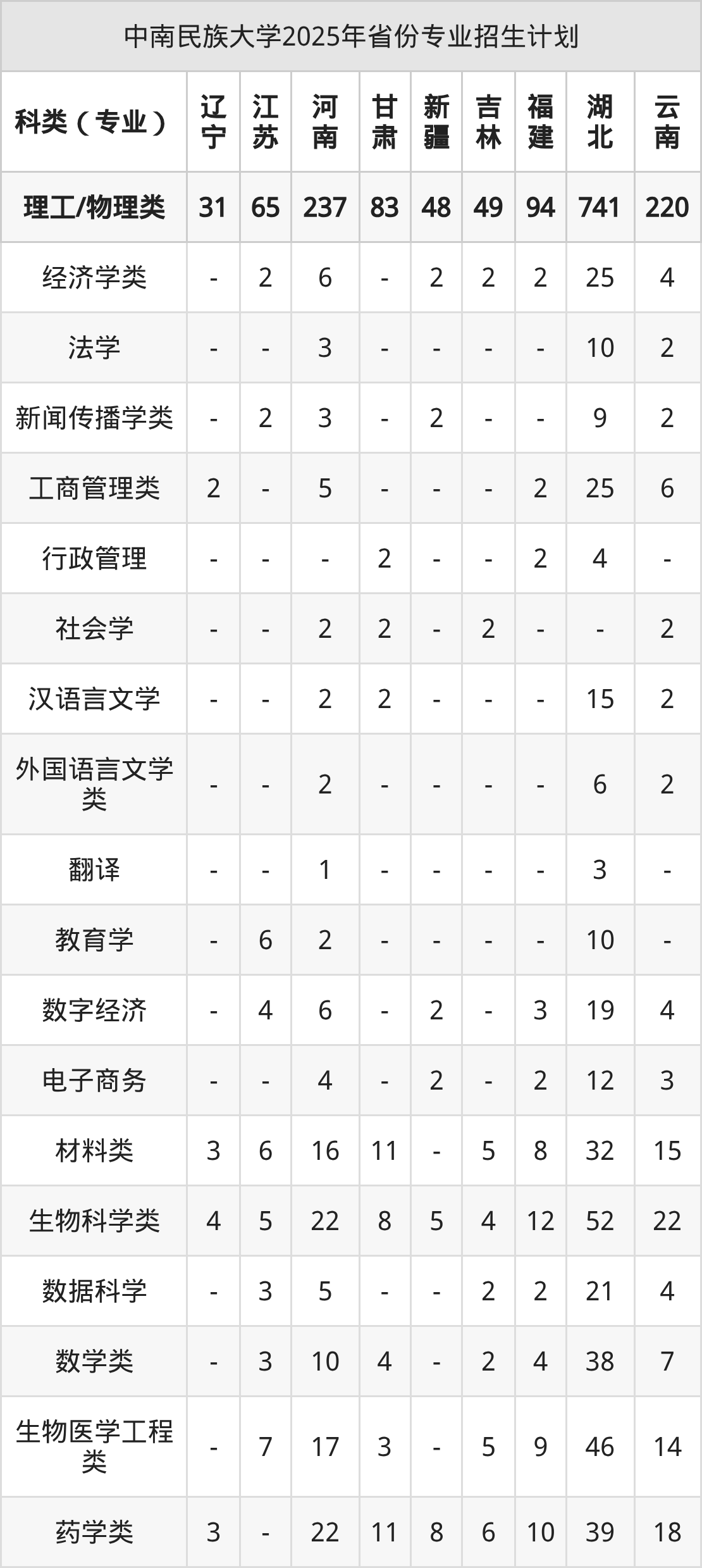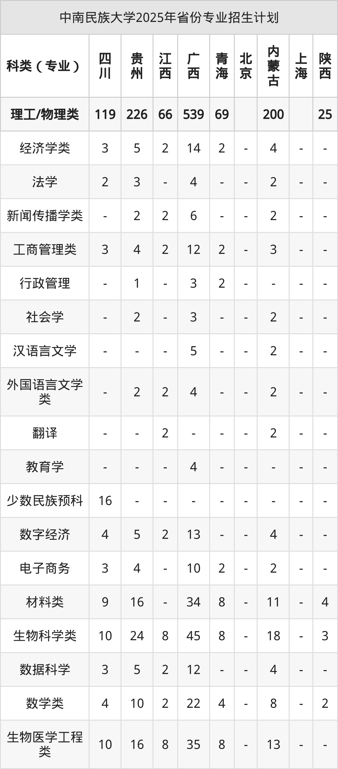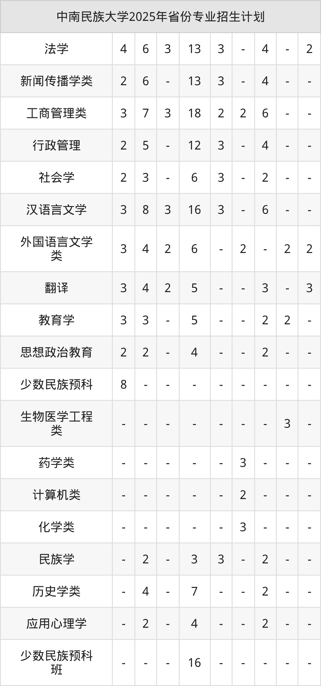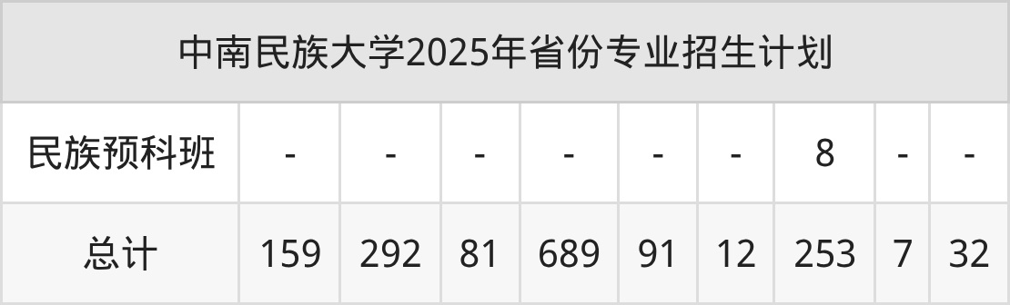 2026年中南民族大学本科招生计划待公布,下面附上2025年数据,暂供参考: