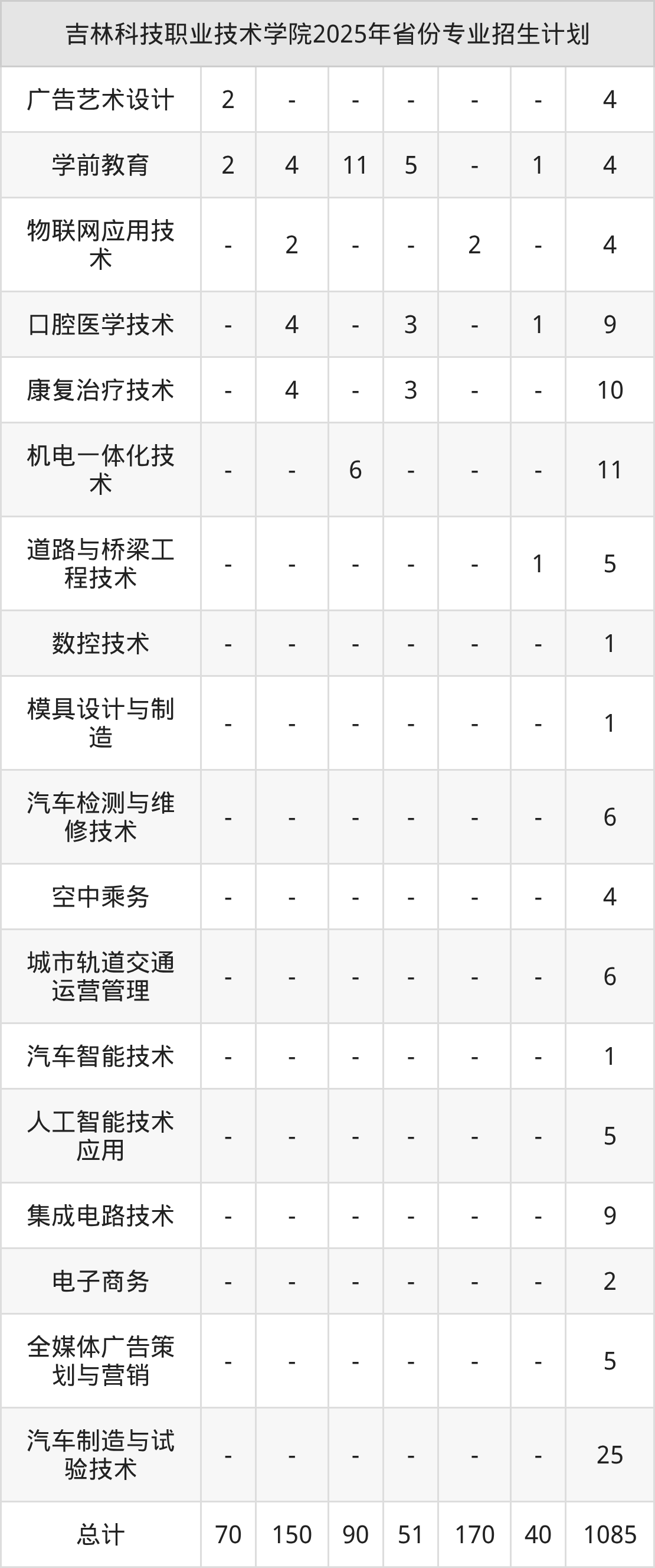 而各省份的招生计划数为山东90人,内蒙古51人,辽宁170人,河南40人,吉林1085人等。
