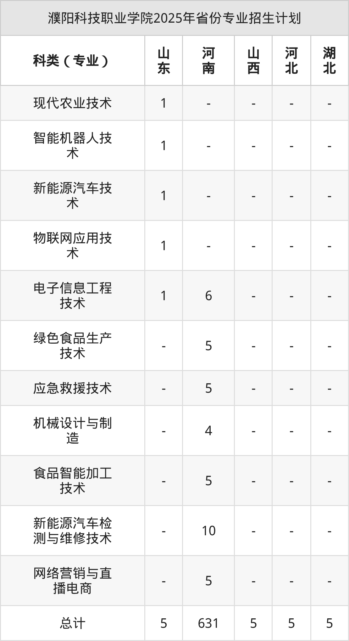而各省份的招生计划数为河北5人,湖北5人,山东5人,河南631人,山西5人。