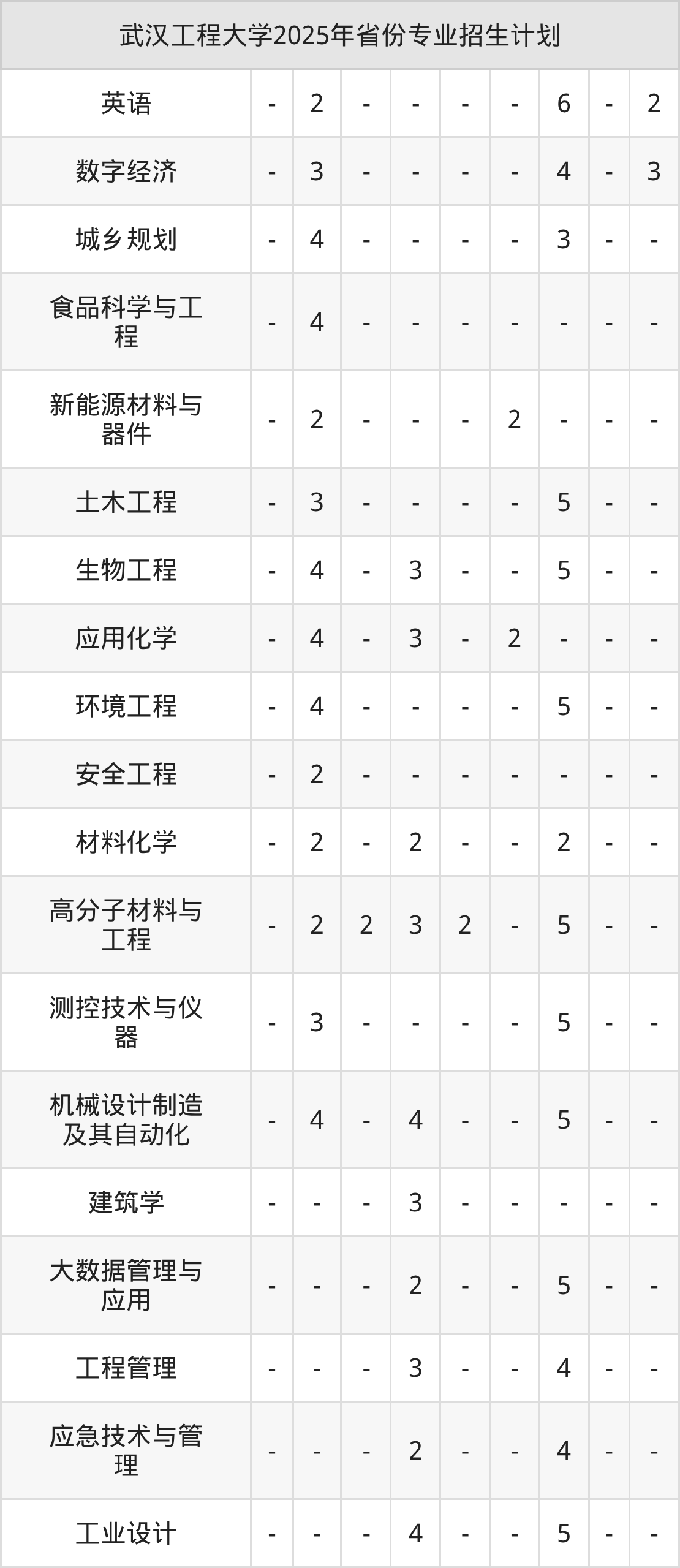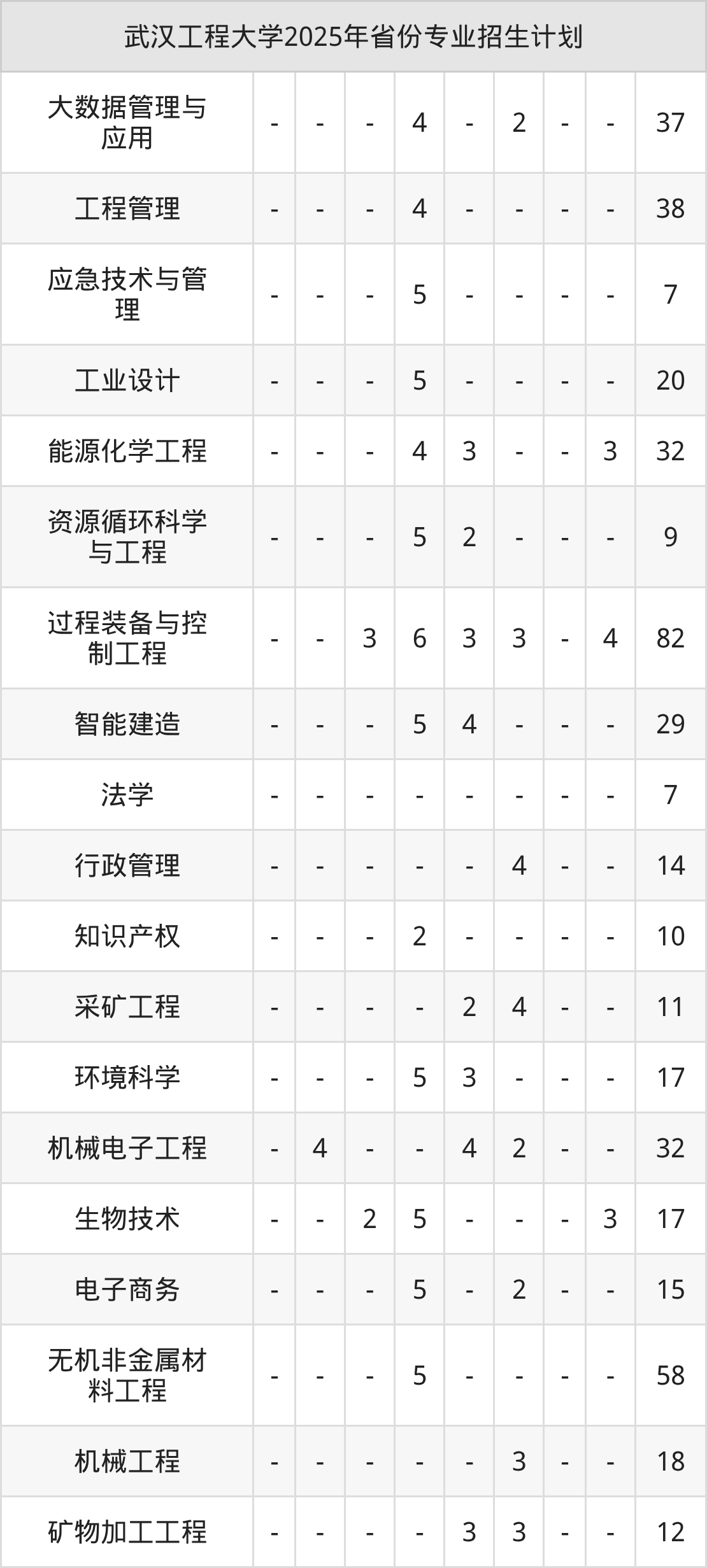 2025年武汉工程大学计划招收本科生4804人,其中大数据管理与应用专业70人,应急技术与管理专业30人,生物工程专业89人,环境工程专业115人,工业设计专业47人等。