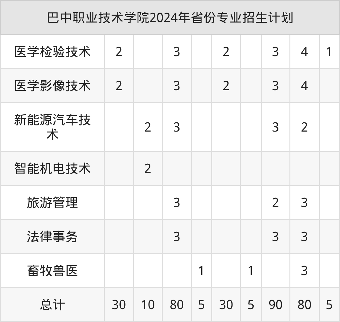 2024年巴中职业技术学院计划招收专科生840人,其中新能源汽车技术专业40人,建筑工程技术专业3人,医学检验技术专业86人,建筑室内设计专业5人,大数据与会计专业2人等。