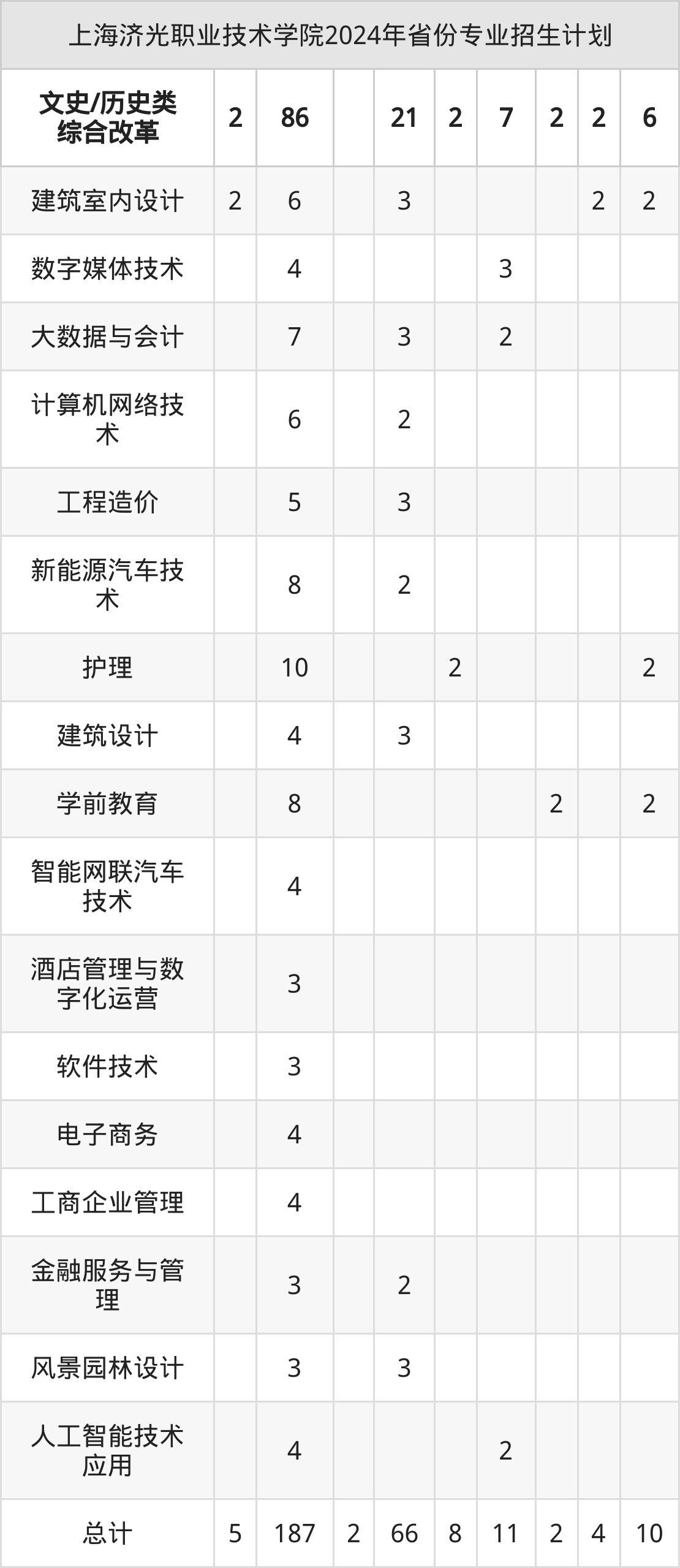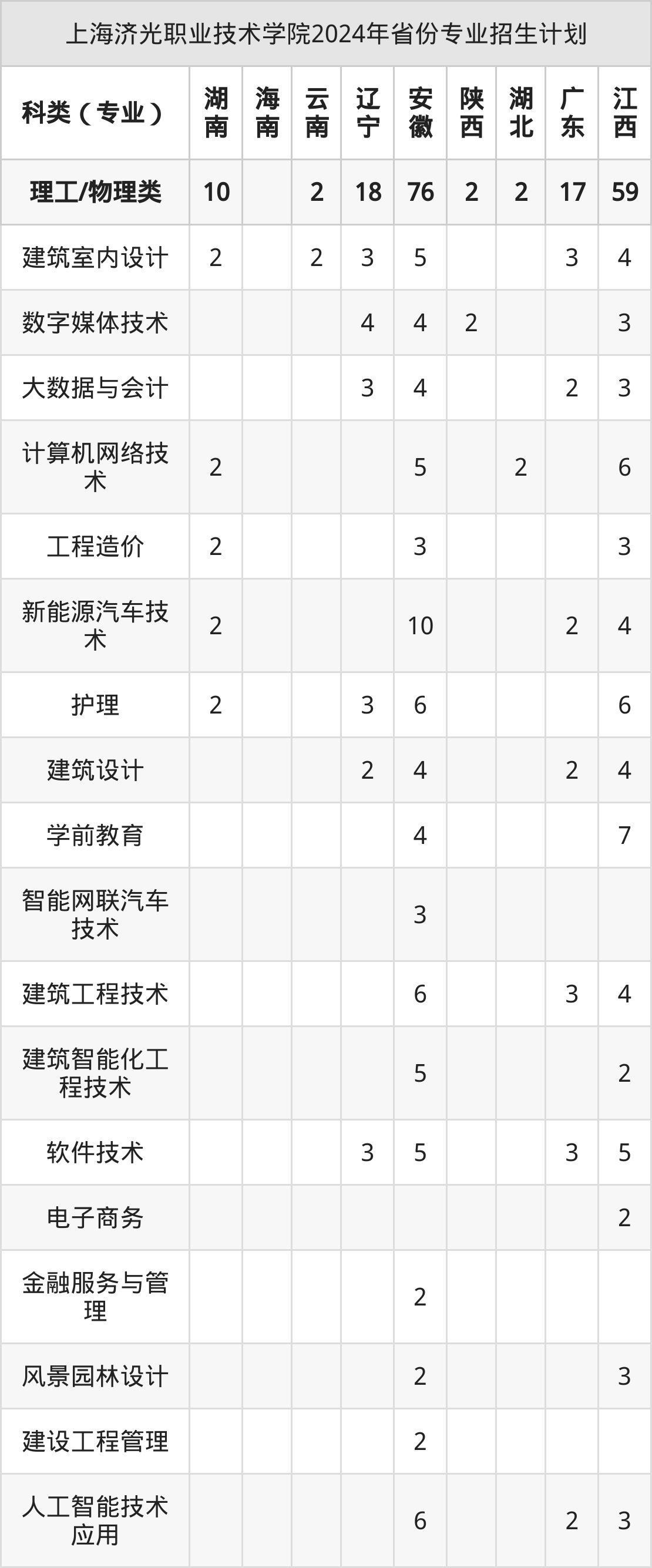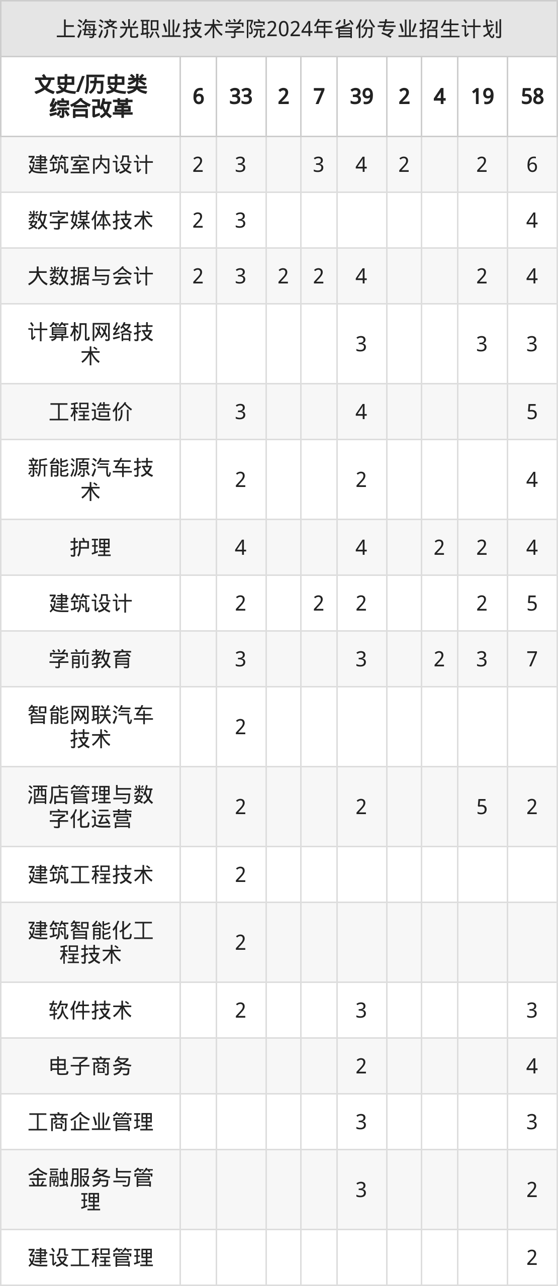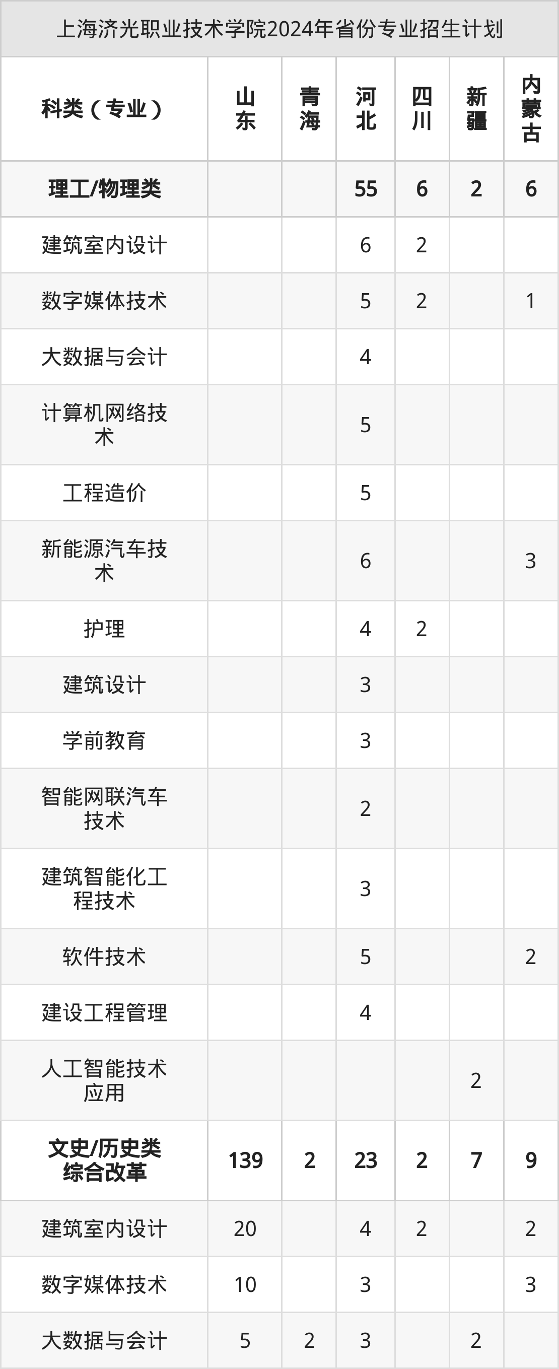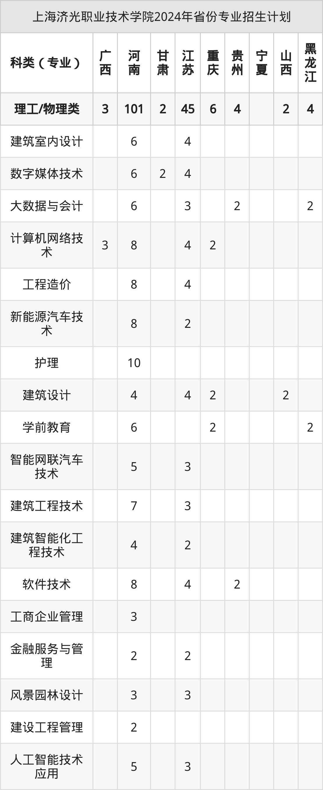 2024年上海济光职业技术学院计划招收专科生902人,其中数字媒体技术专业65人,计算机网络技术专业65人,建筑设计专业55人,金融服务与管理专业21人,新能源汽车技术专业63人等。