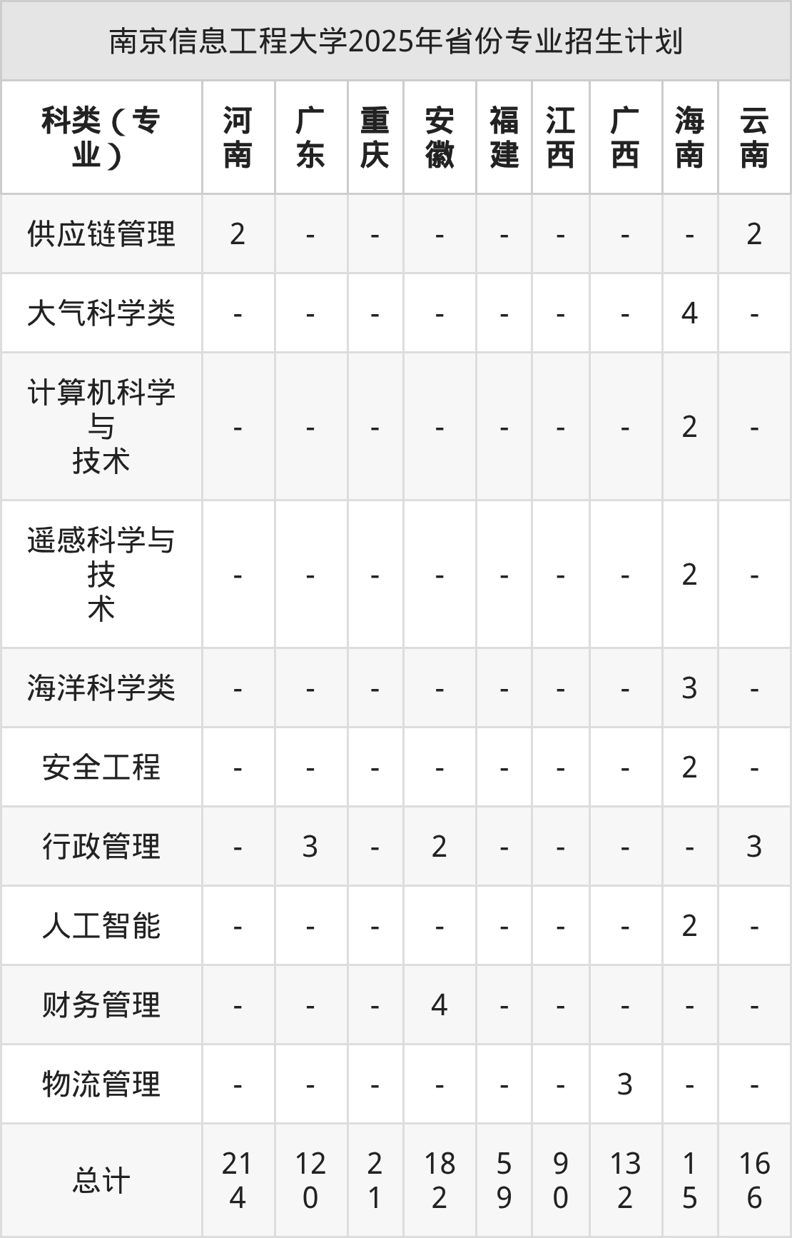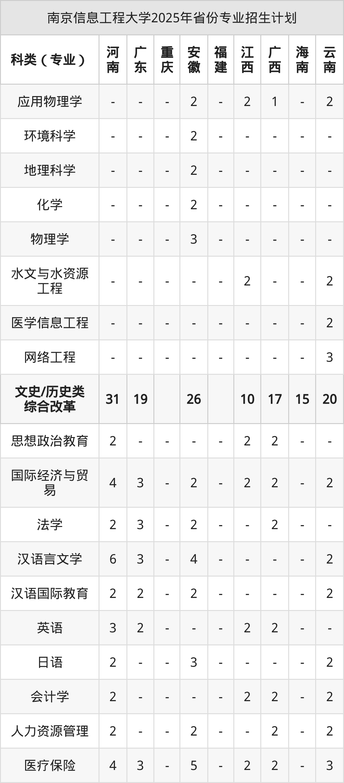而各省份的招生计划数为安徽182人,福建59人,海南15人,甘肃102人,湖南99人等。