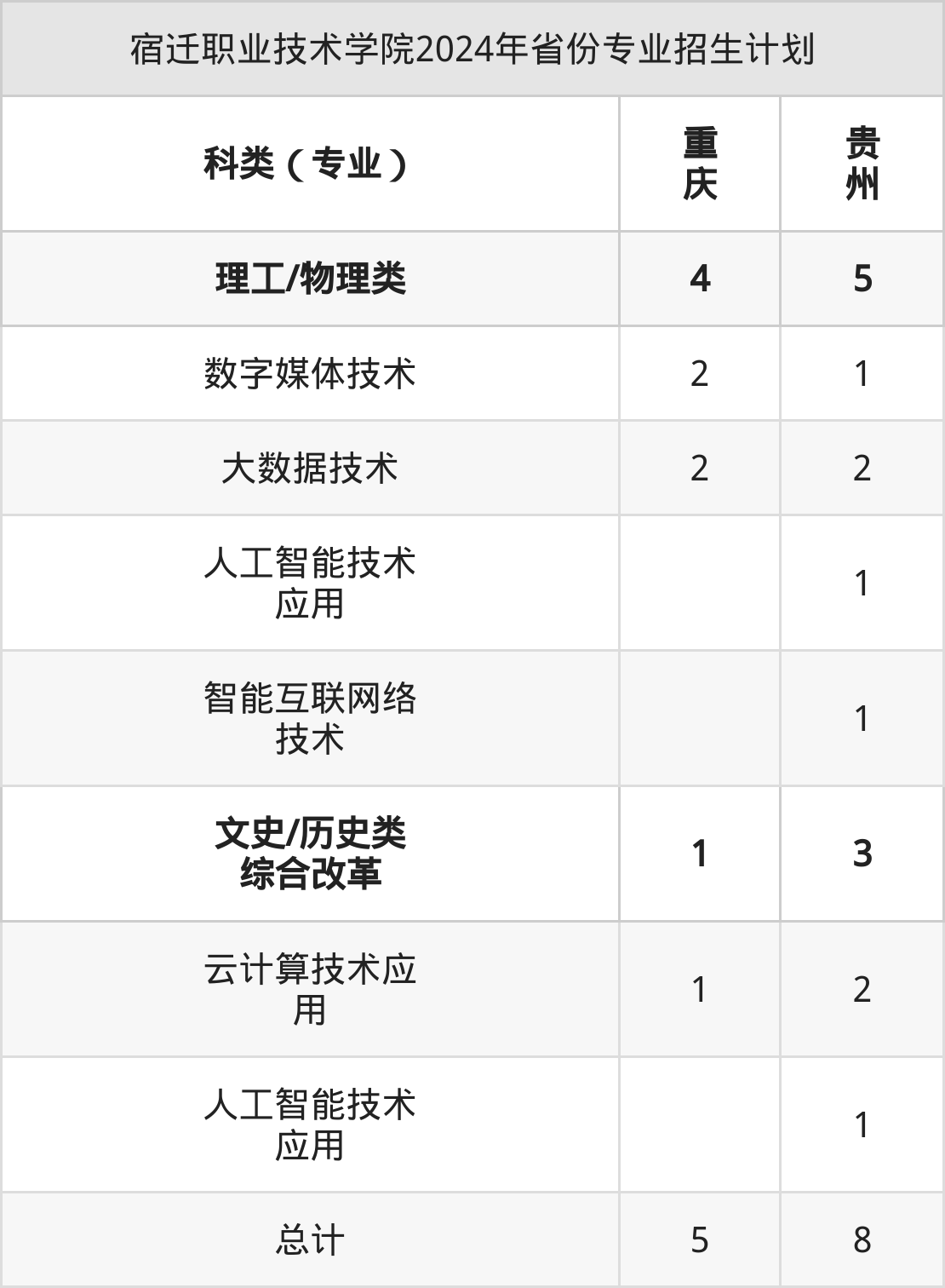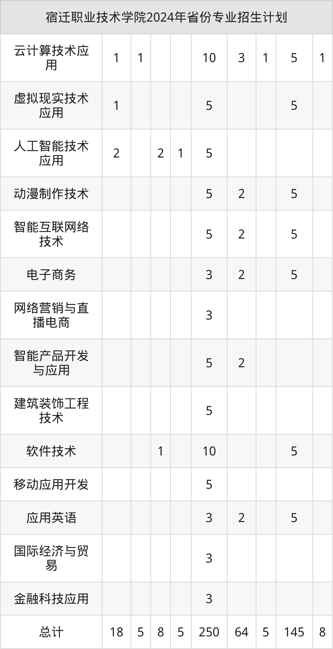 2024年宿迁职业技术学院计划招收专科生710人,其中电子商务专业13人,人工智能技术应用专业60人,动漫制作技术专业36人,建筑装饰工程技术专业26人,软件技术专业56人等。