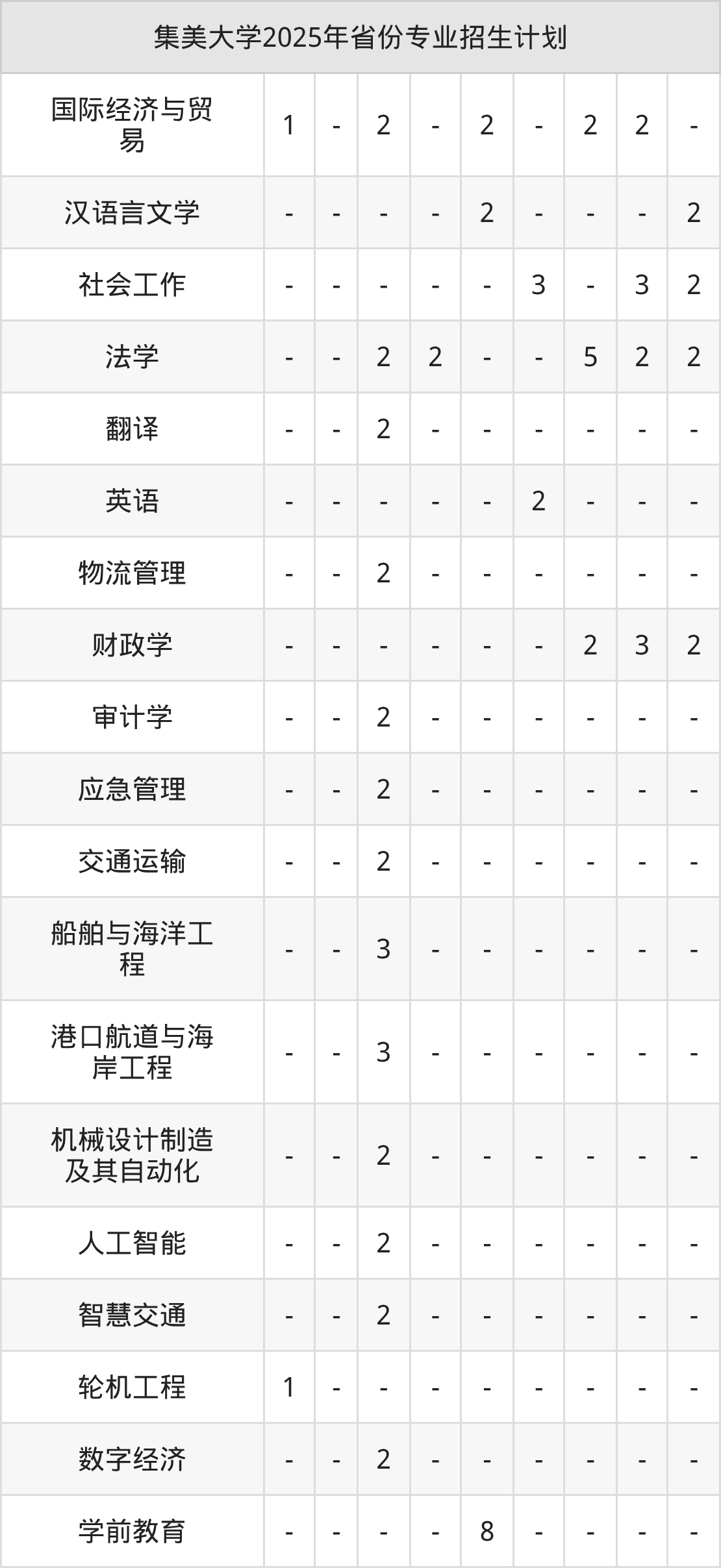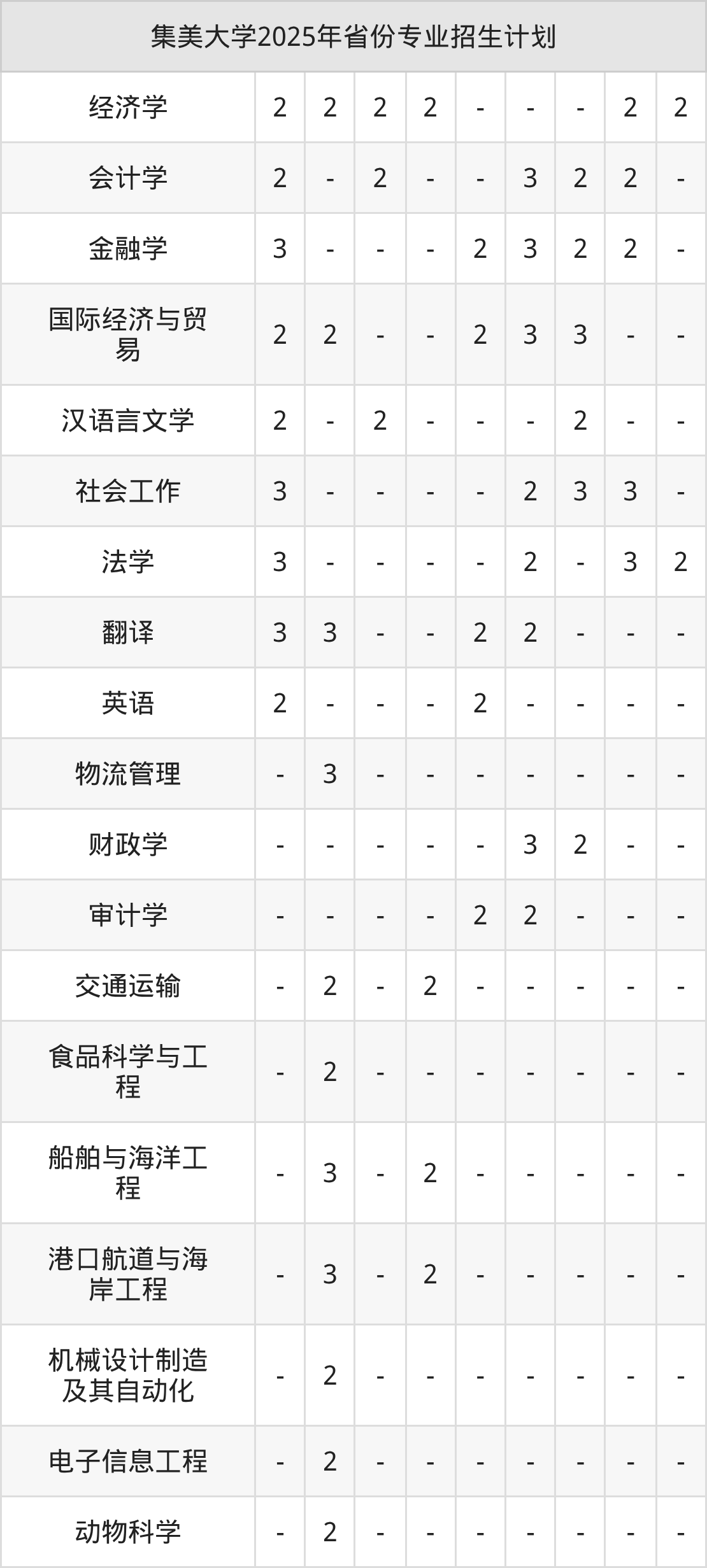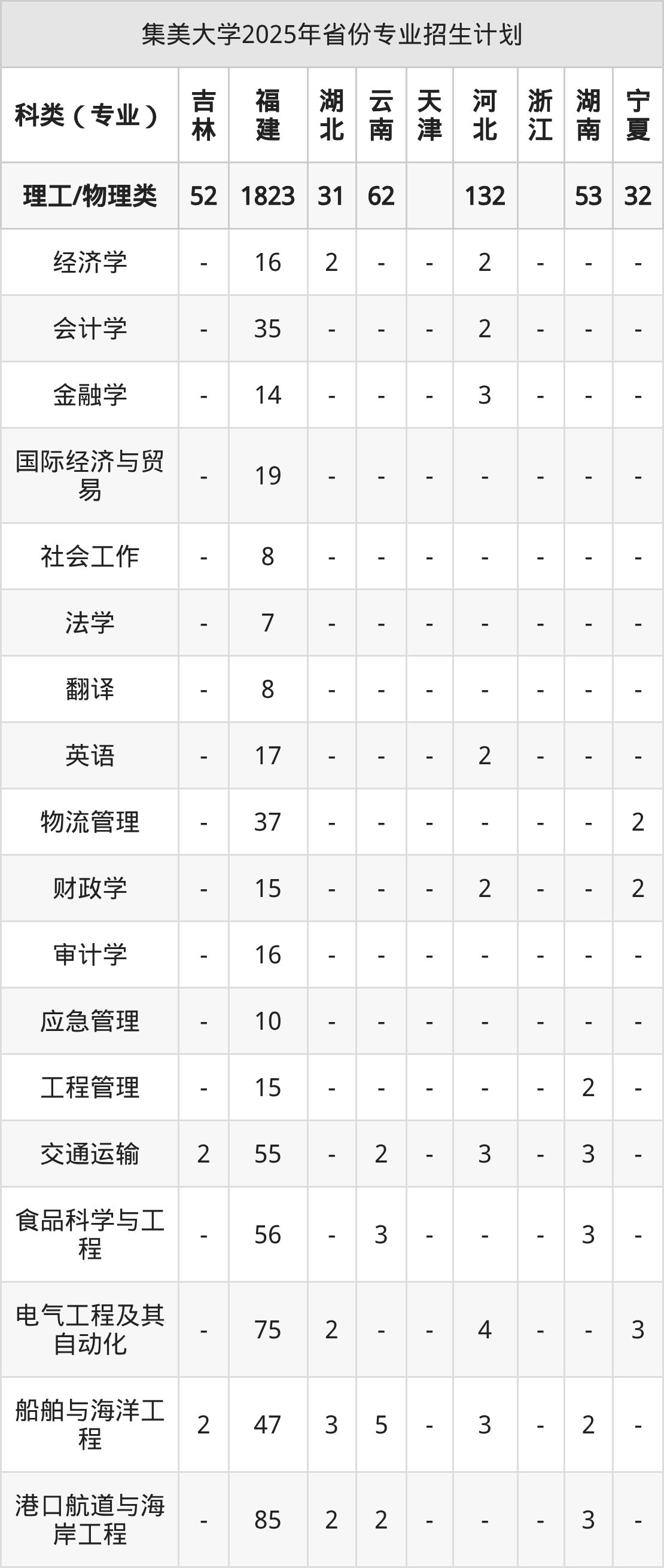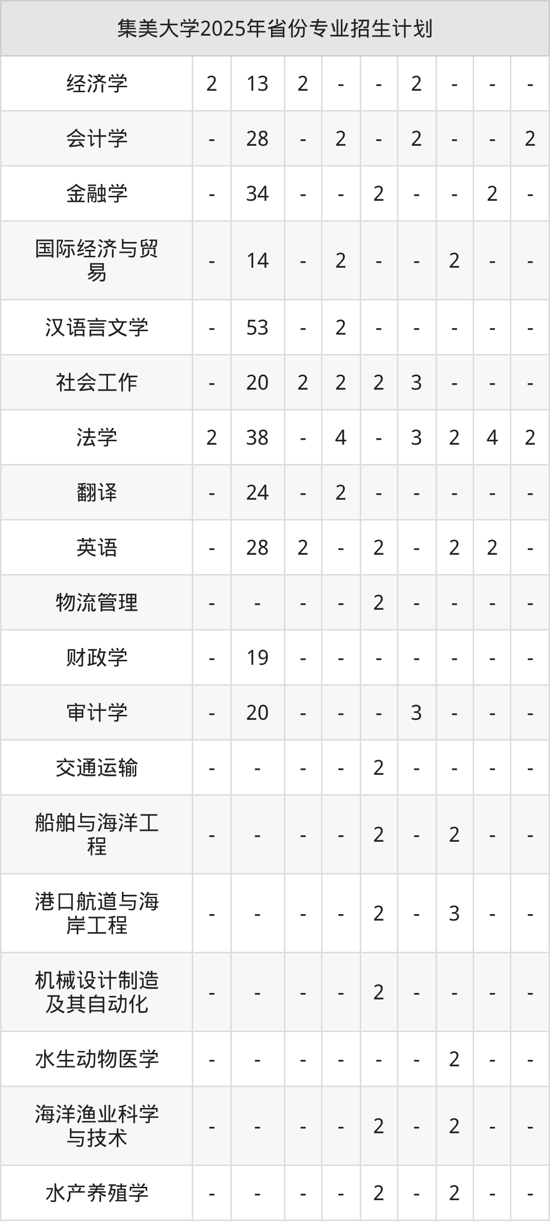 2025年集美大学计划招收本科生4469人,其中经济学专业59人,国际经济与贸易专业67人,水产养殖学专业113人,轮机工程专业165人,法学专业101人等。