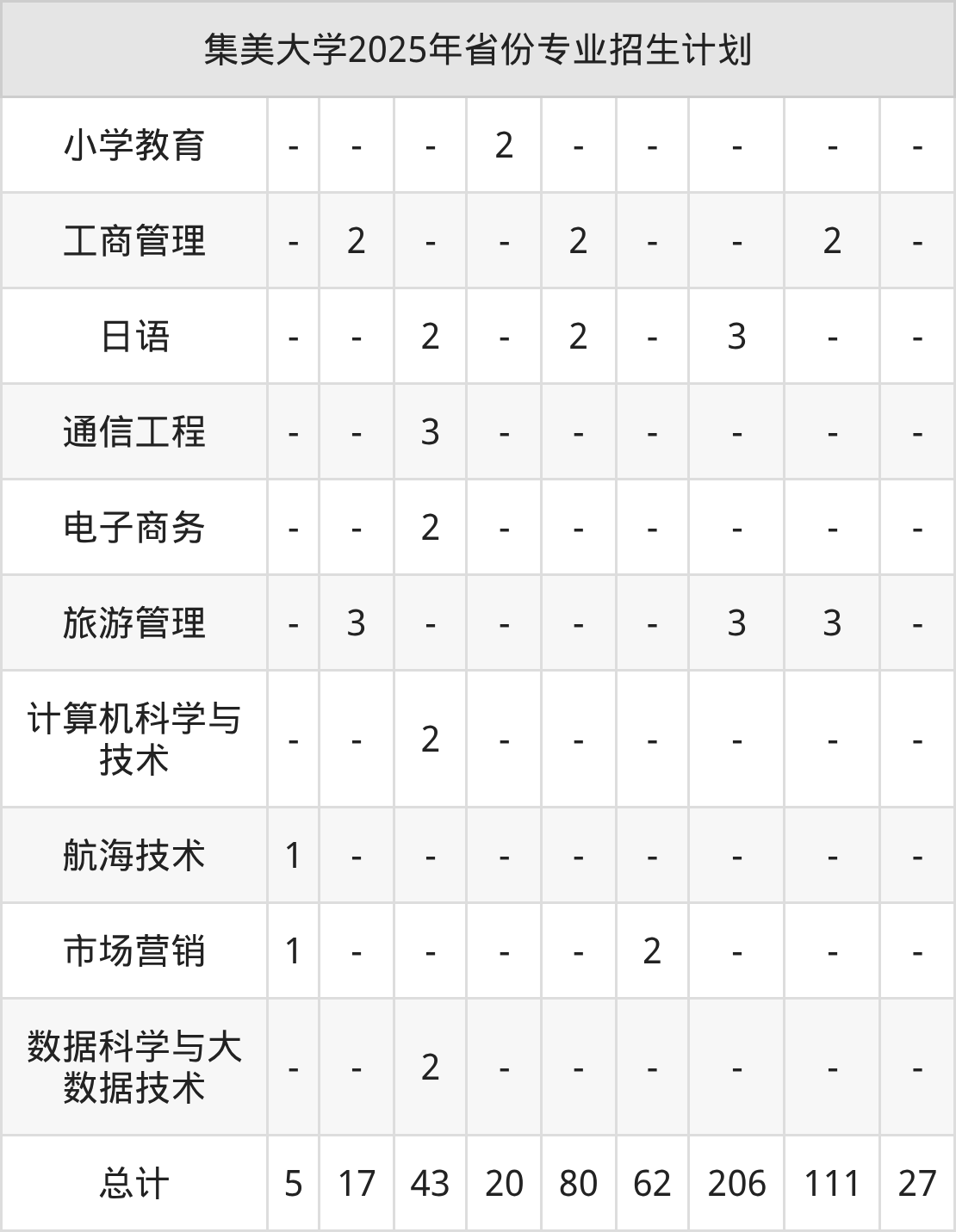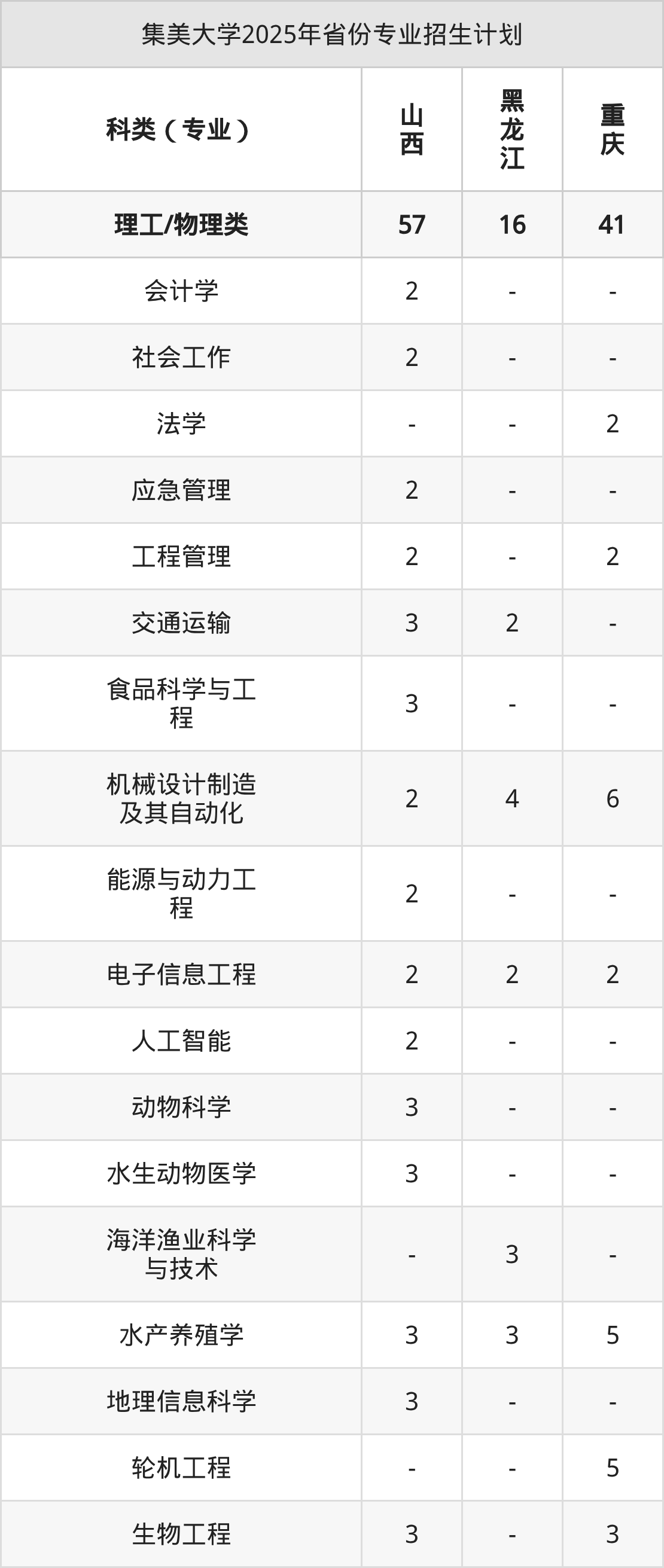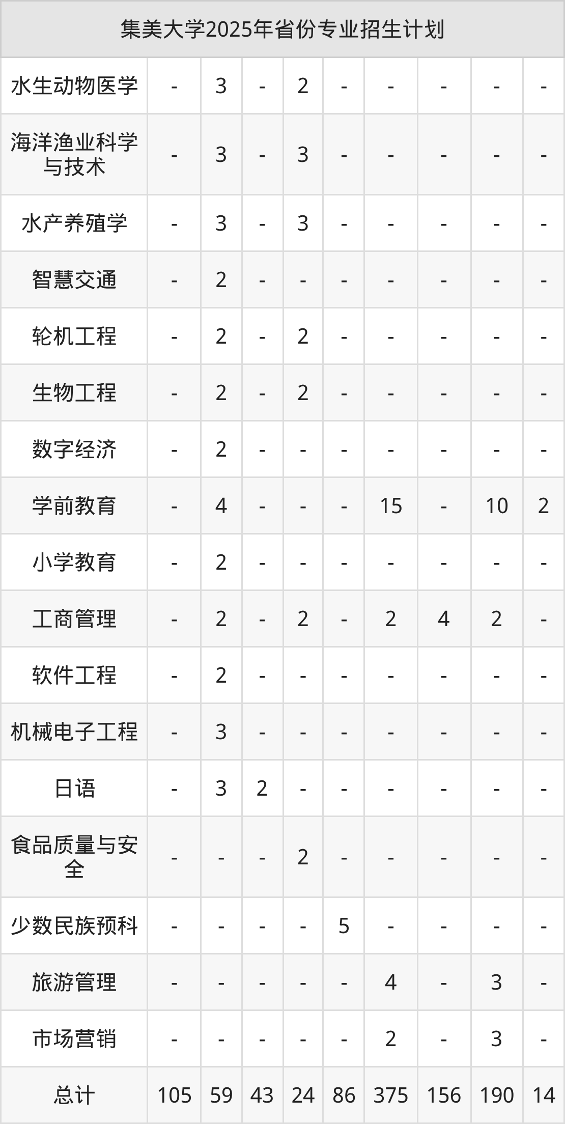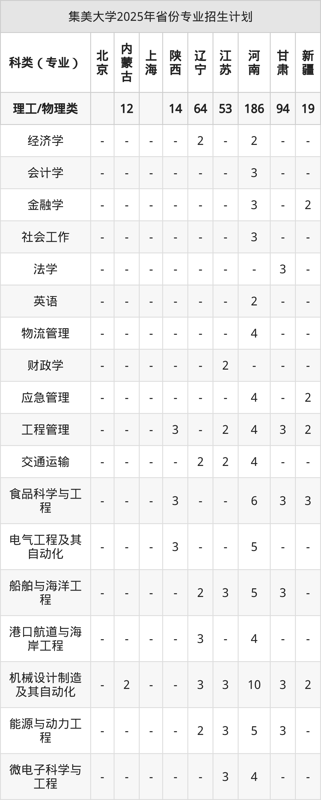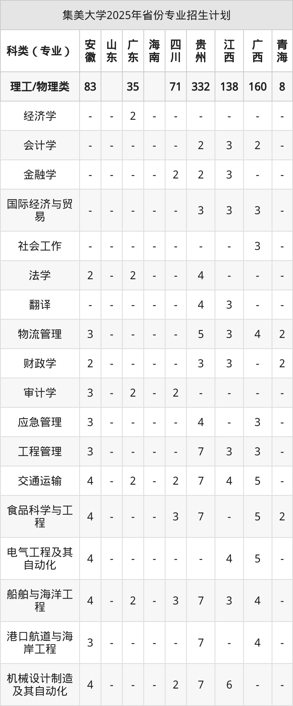2025年集美大学计划招收本科生4469人,其中经济学专业59人,国际经济与贸易专业67人,水产养殖学专业113人,轮机工程专业165人,法学专业101人等。