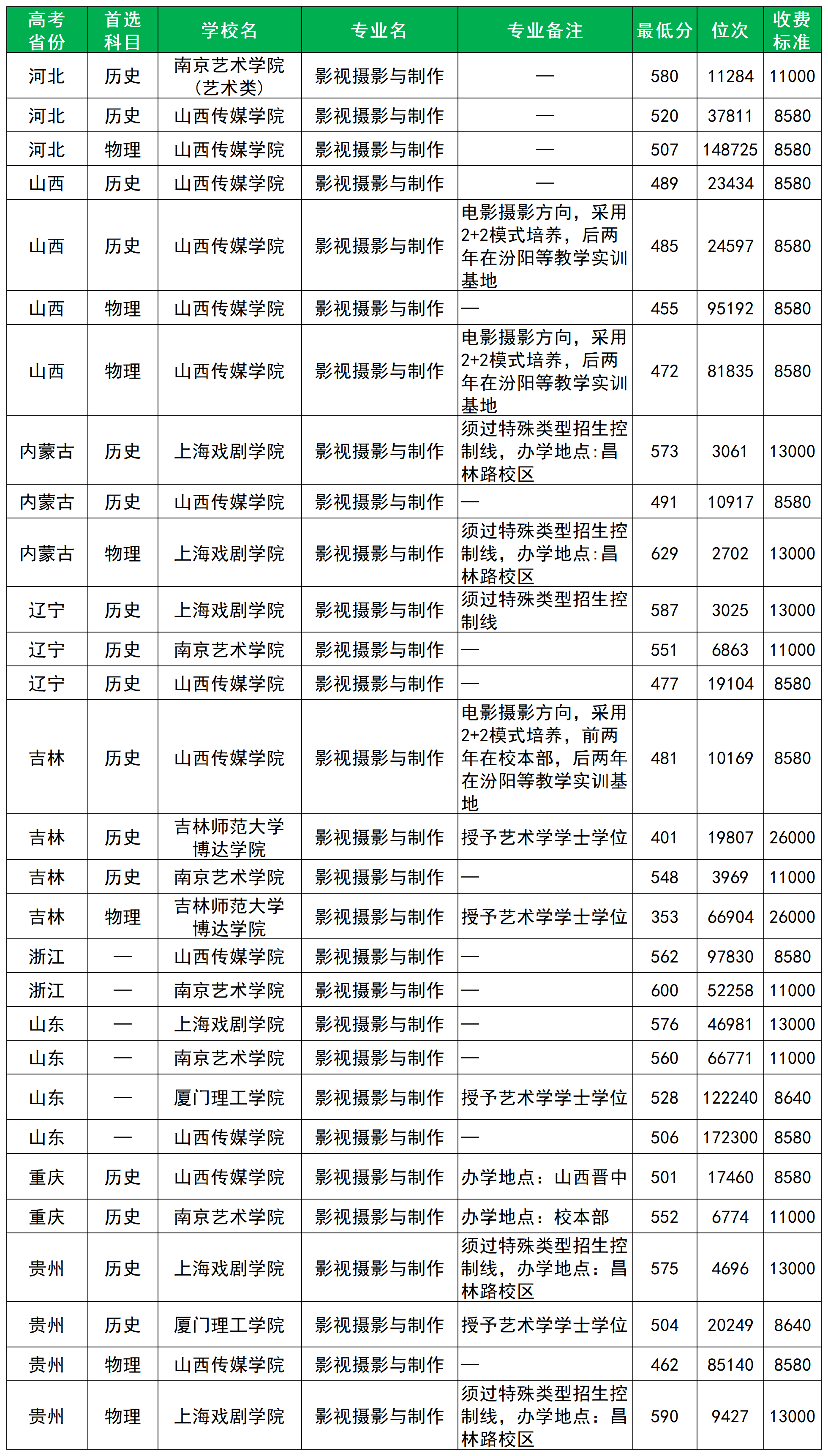 艺术类专业收分不同,下文整理了影视摄影与制作专业在各地各院校的最低录取分数线,以供大家参考。