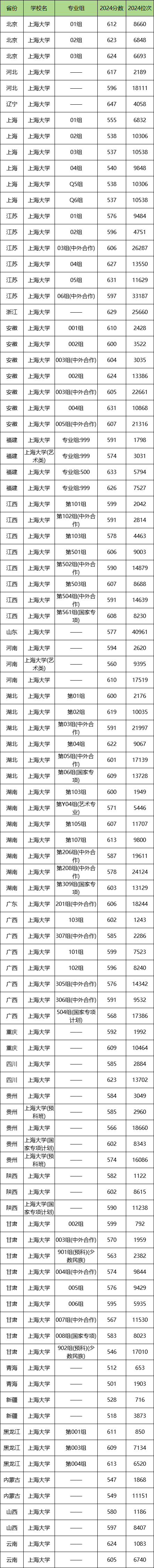 以下为2024年高考上海大学各省市录取分数线: