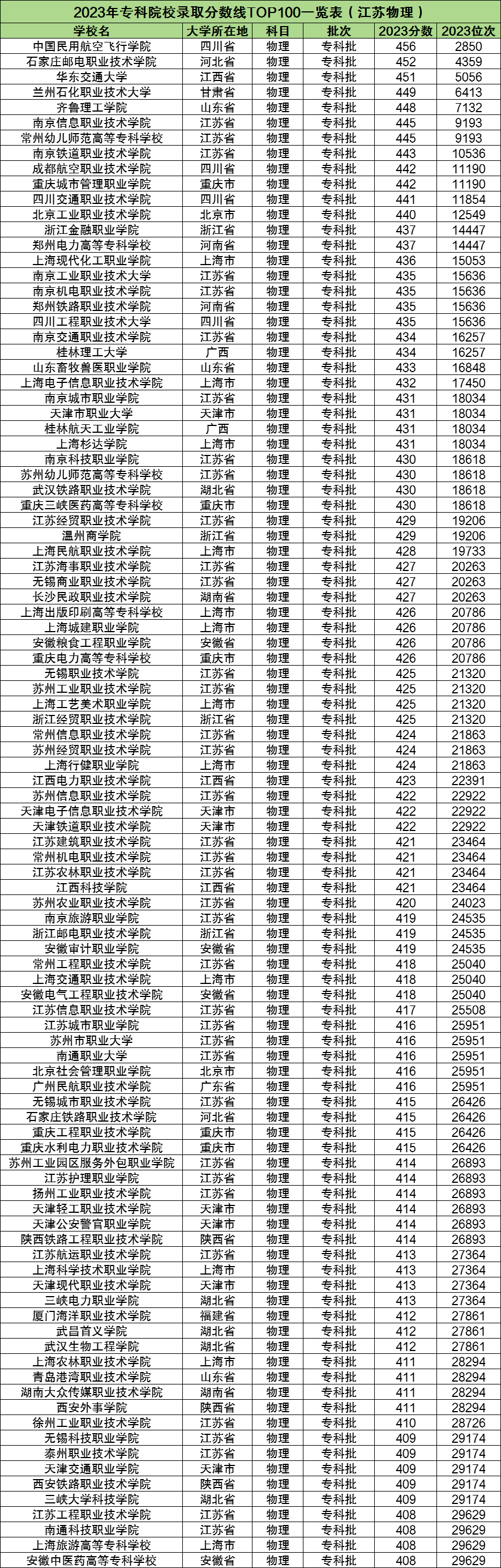 以下是2023年专科院校在江苏省物理类的录取分数线TOP100一览表: