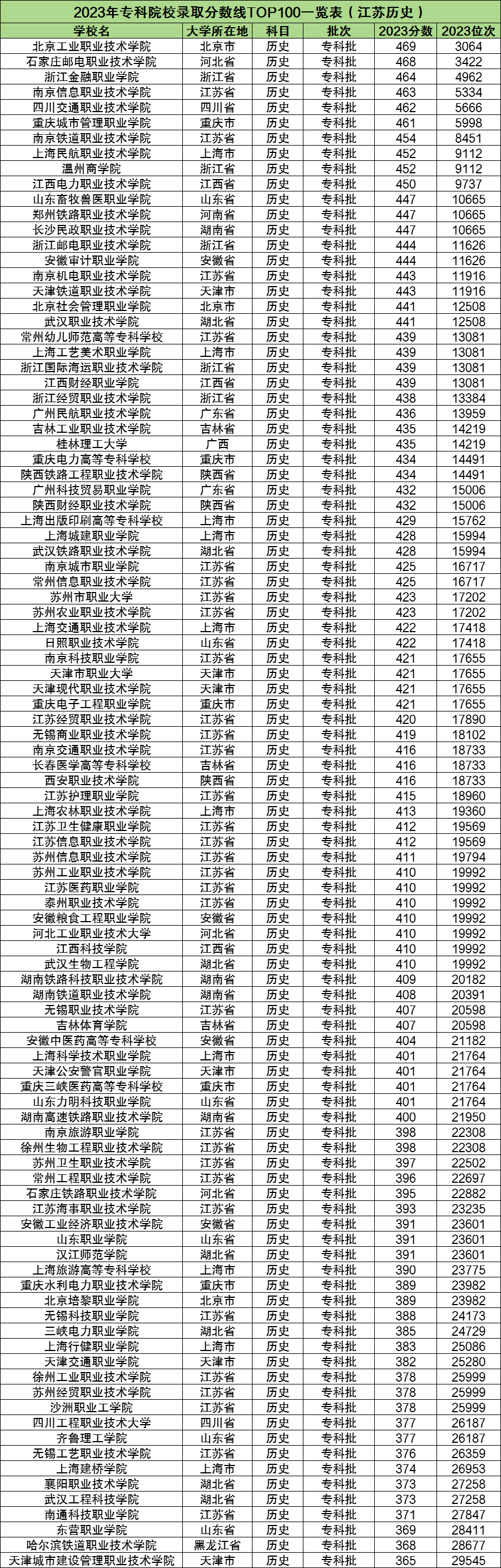 以下是2023年专科院校在江苏省历史类的录取分数线TOP100一览表: