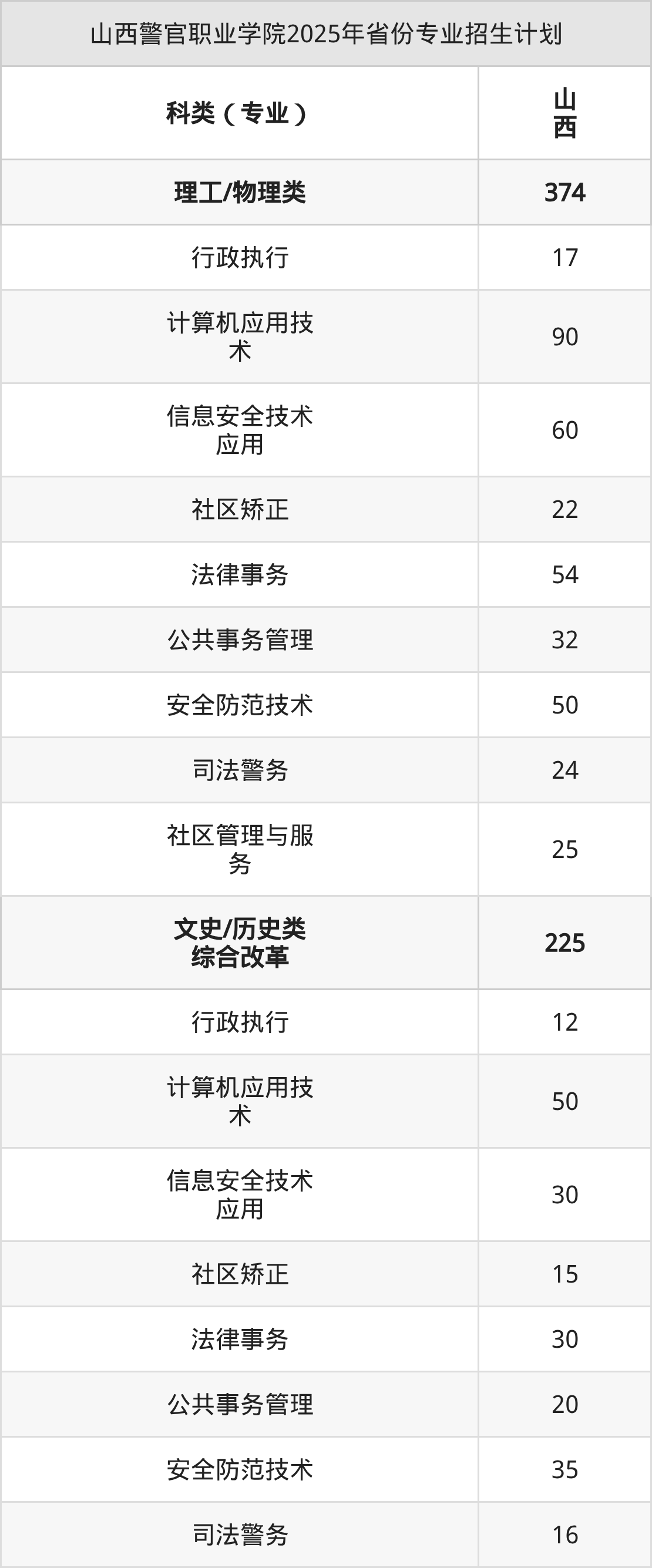 2026年山西警官职业学院专科招生计划待公布,下面附上2025年数据,暂供参考: