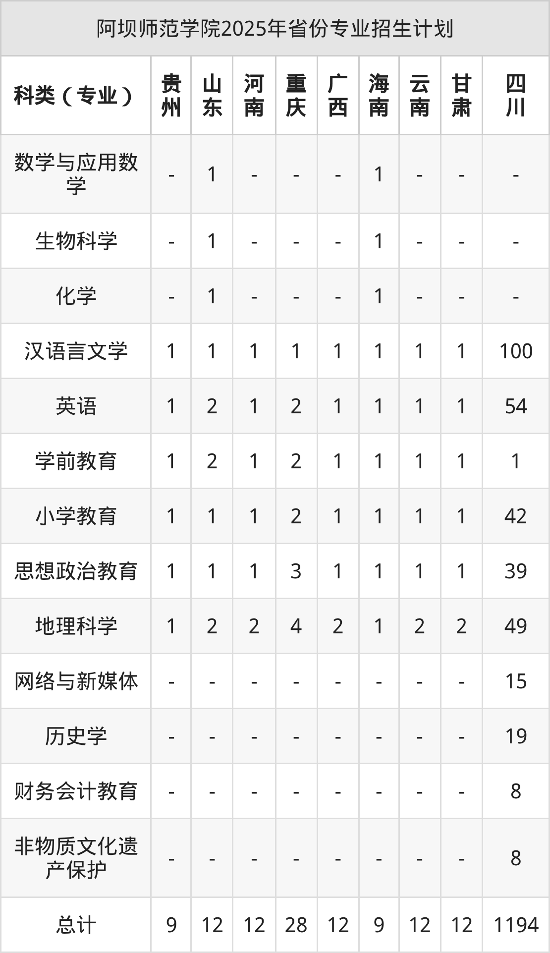 而各省份的招生计划数为贵州9人,河南12人,重庆28人,海南9人,四川1194人等。