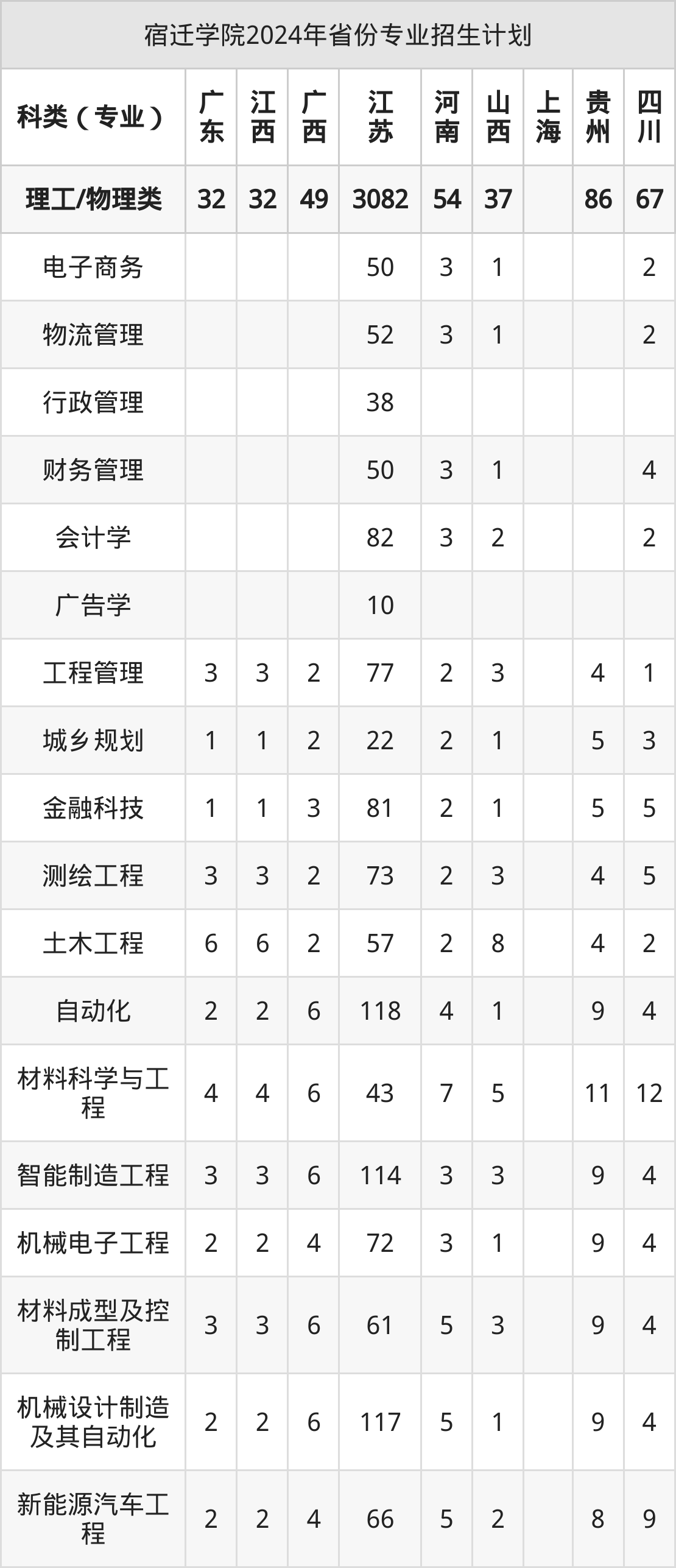 2024年宿迁学院计划招收本科生4344人,其中土木工程专业100人,应急管理专业50人,物理学专业50人,物流管理专业110人,财务管理专业100人等。