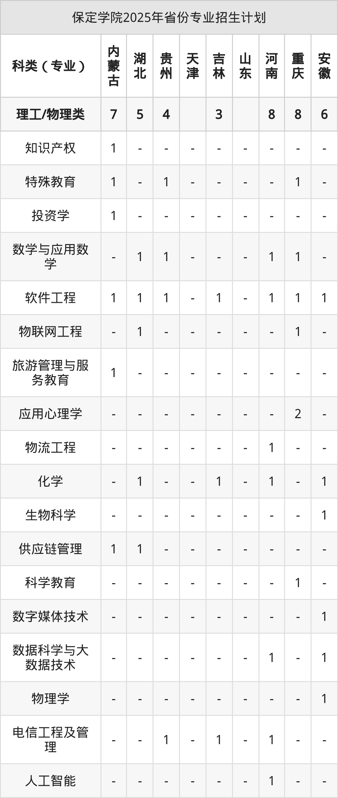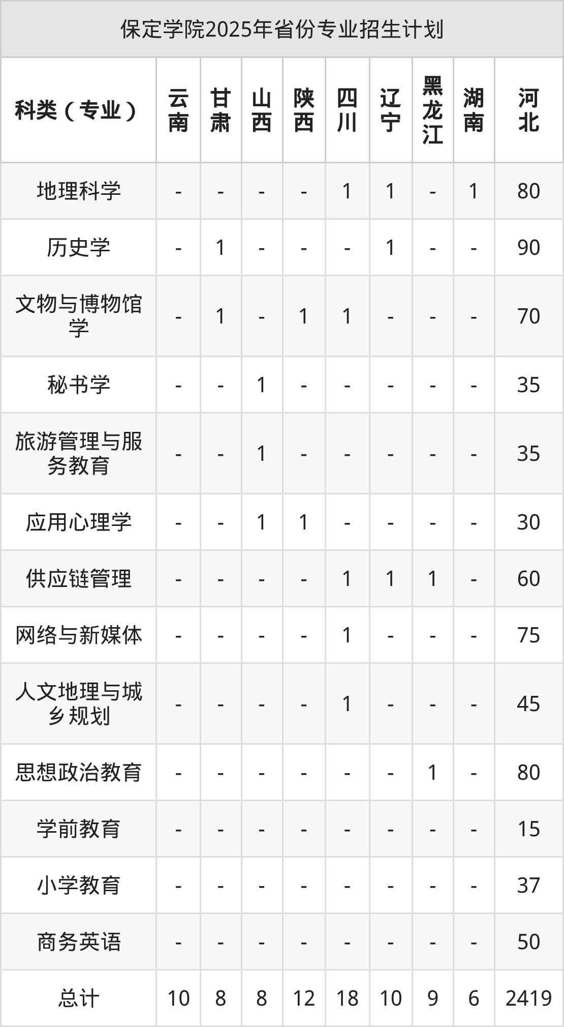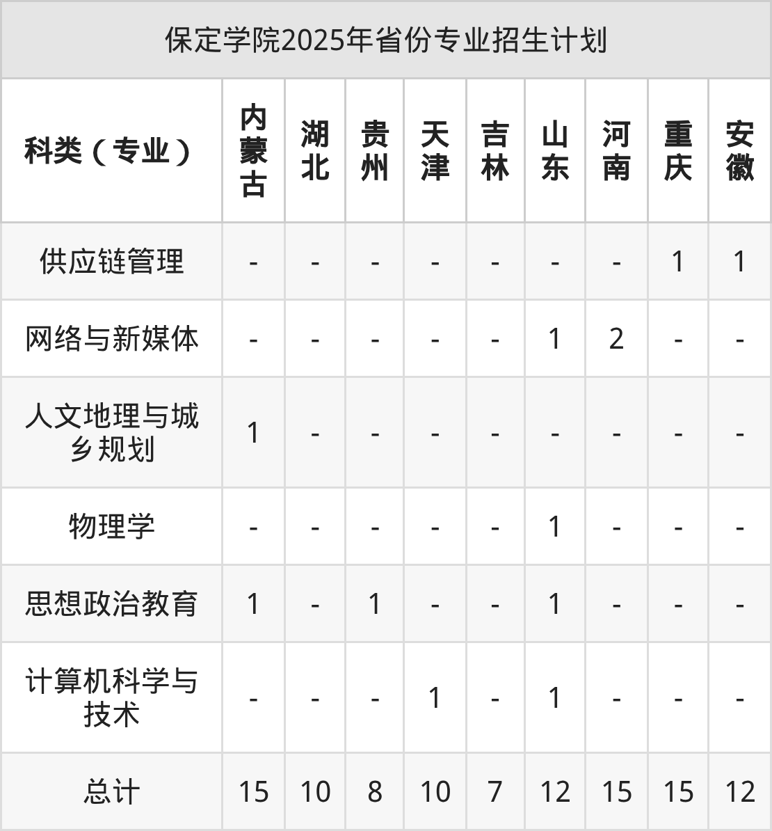 而各省份的招生计划数为山东12人,河南15人,重庆15人,陕西12人,河北2419人等。