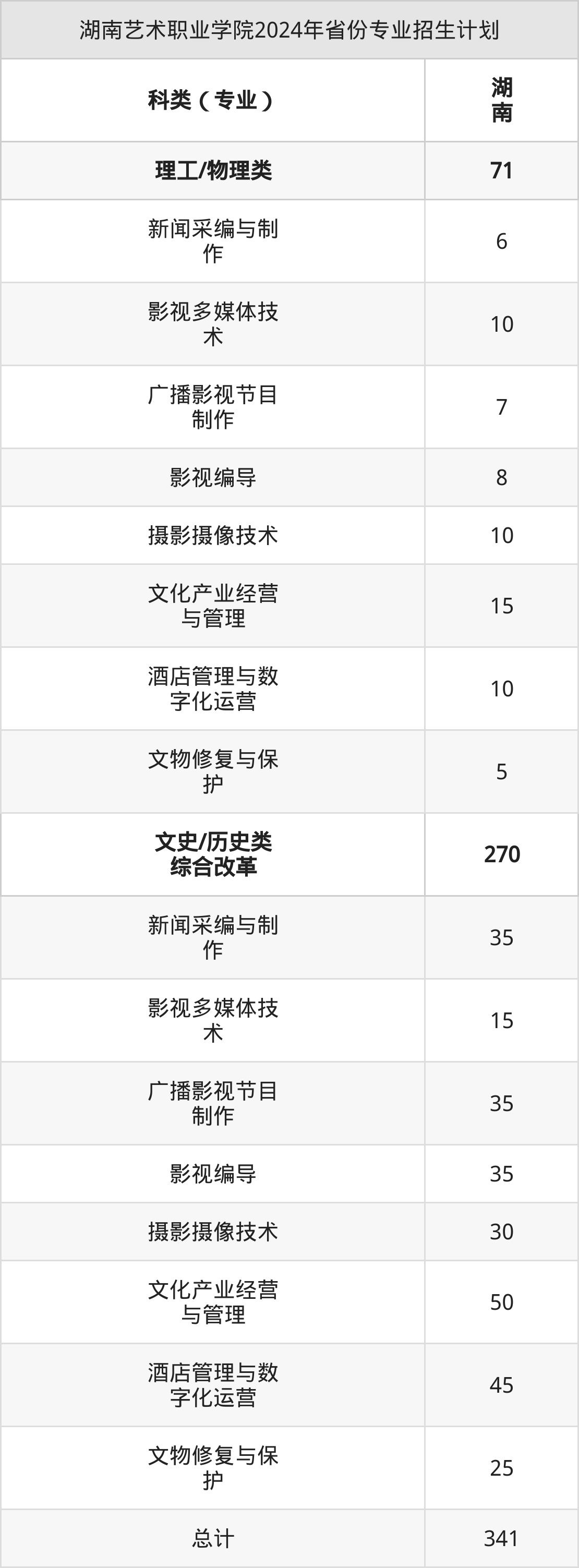 2024年湖南艺术职业学院计划招收专科生341人,其中文化产业经营与管理专业65人,酒店管理与数字化运营专业55人,文物修复与保护专业30人,新闻采编与制作专业41人,影视多媒体技术专业25人等。