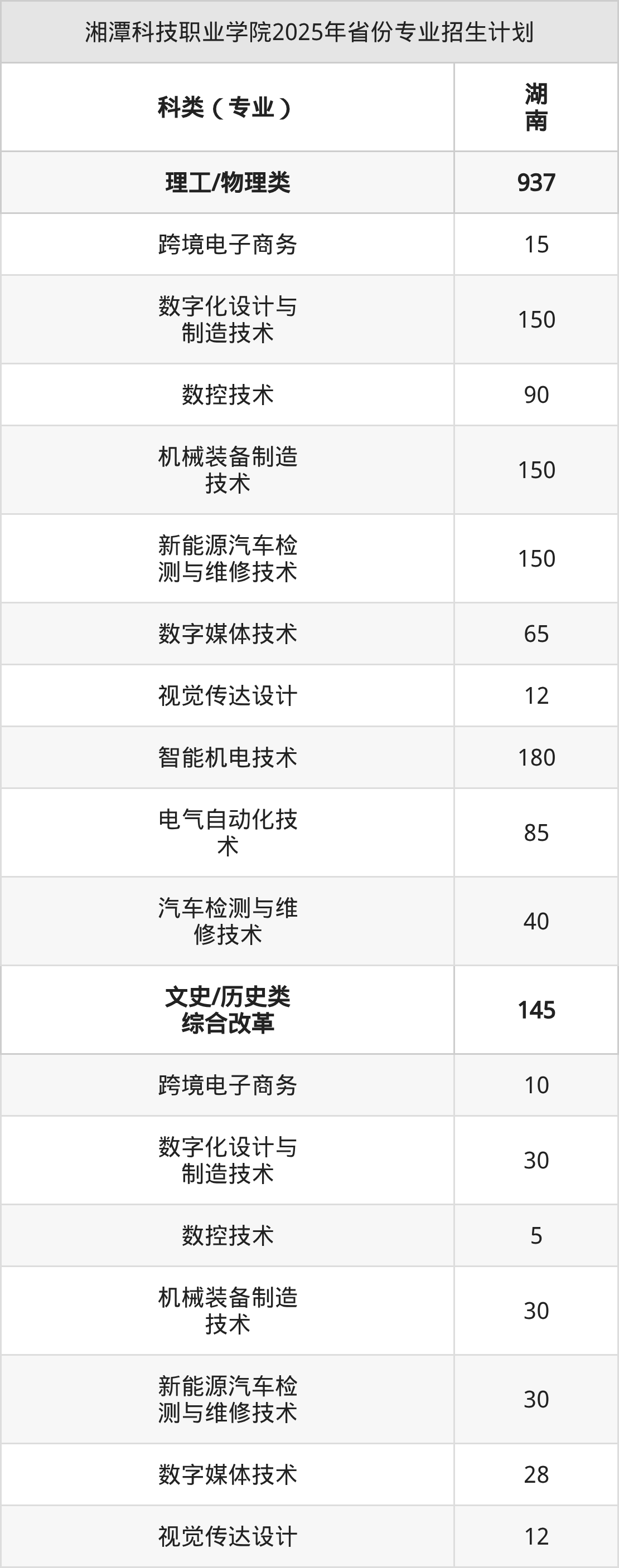 2026年湘潭科技职业学院专科招生计划待公布,下面附上2025年数据,暂供参考: