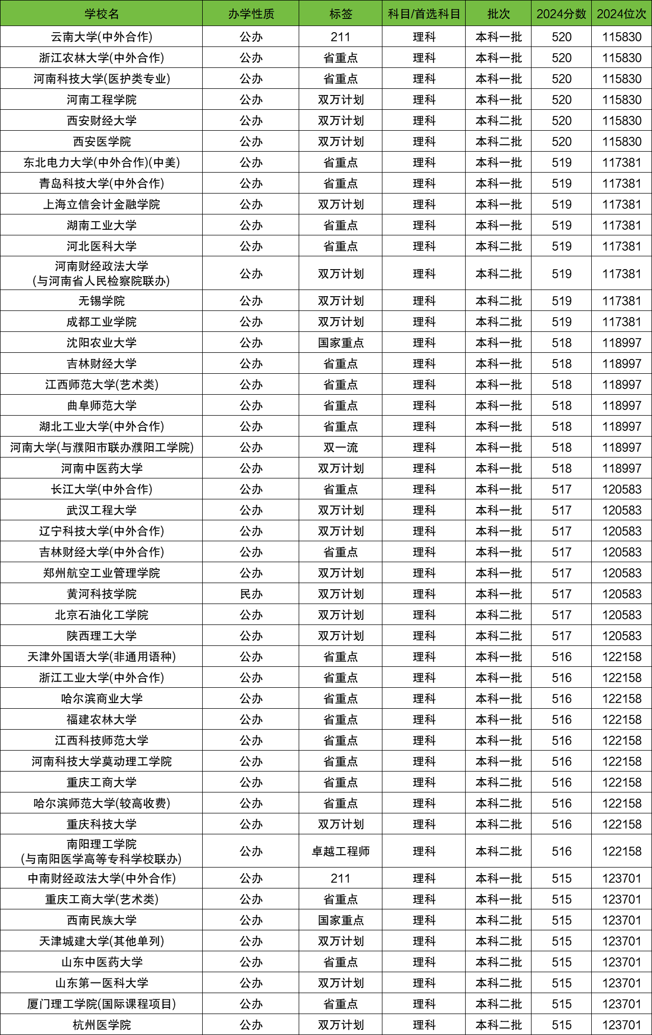 温馨提示:本文仅以河南省理科为例,为大家展示2024年高考录取位次在115000-125000名之间的大学名单汇总。