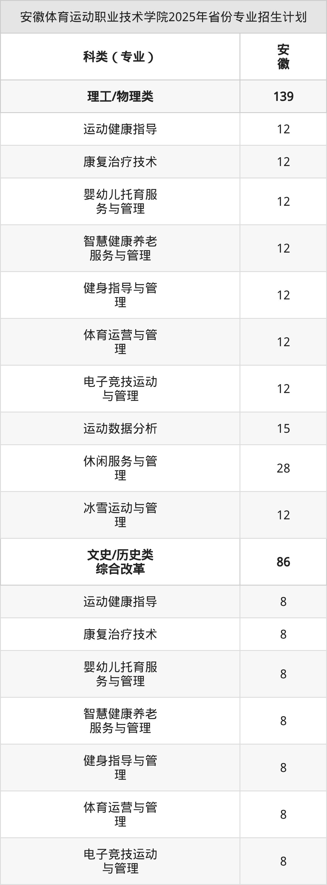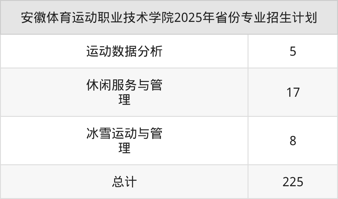 2026年安徽体育运动职业技术学院专科招生计划待公布,下面附上2025年数据,暂供参考: