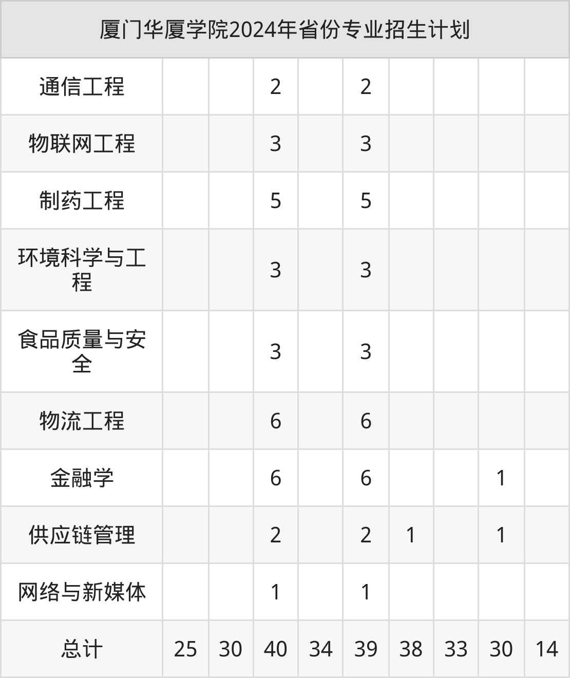 2024年厦门华厦学院计划招收本科生2126人,其中环境科学与工程专业187人,供应链管理专业105人,网络与新媒体专业100人,会展经济与管理专业101人,食品质量与安全专业187人等。