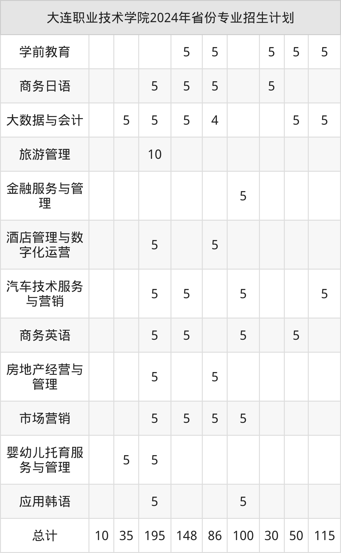 2024年大连职业技术学院计划招收专科生3523人,其中机械设计与制造专业175人,婴幼儿托育服务与管理专业35人,应用韩语专业80人,机电一体化技术专业114人,旅游管理专业38人等。