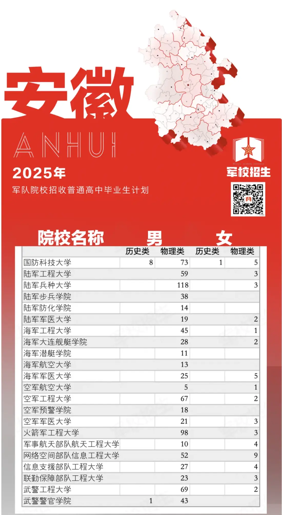 2025年全国22所军校在安徽招生计划总人数938人,其中男生885人、女生53人。下面是各个军校招生人数情况汇总: