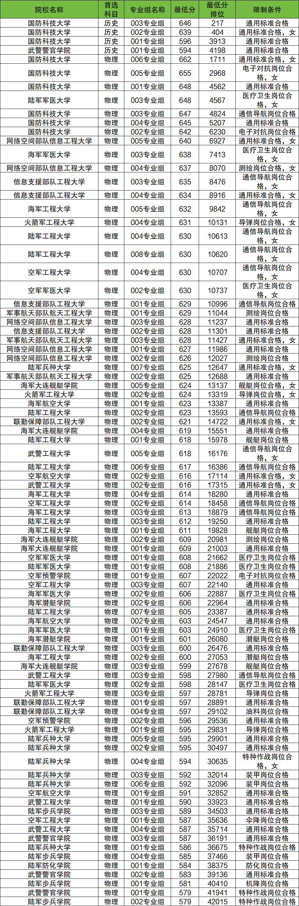 历史类最低分:594分(武警警官学院)。
