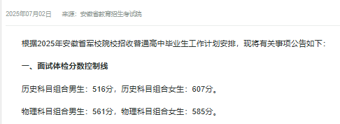 一、2025年安徽军校录取分数线
