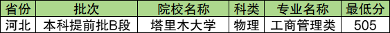 学校国家专项计划物理类最低分数线是505分,对应的招生专业是工商管理类。