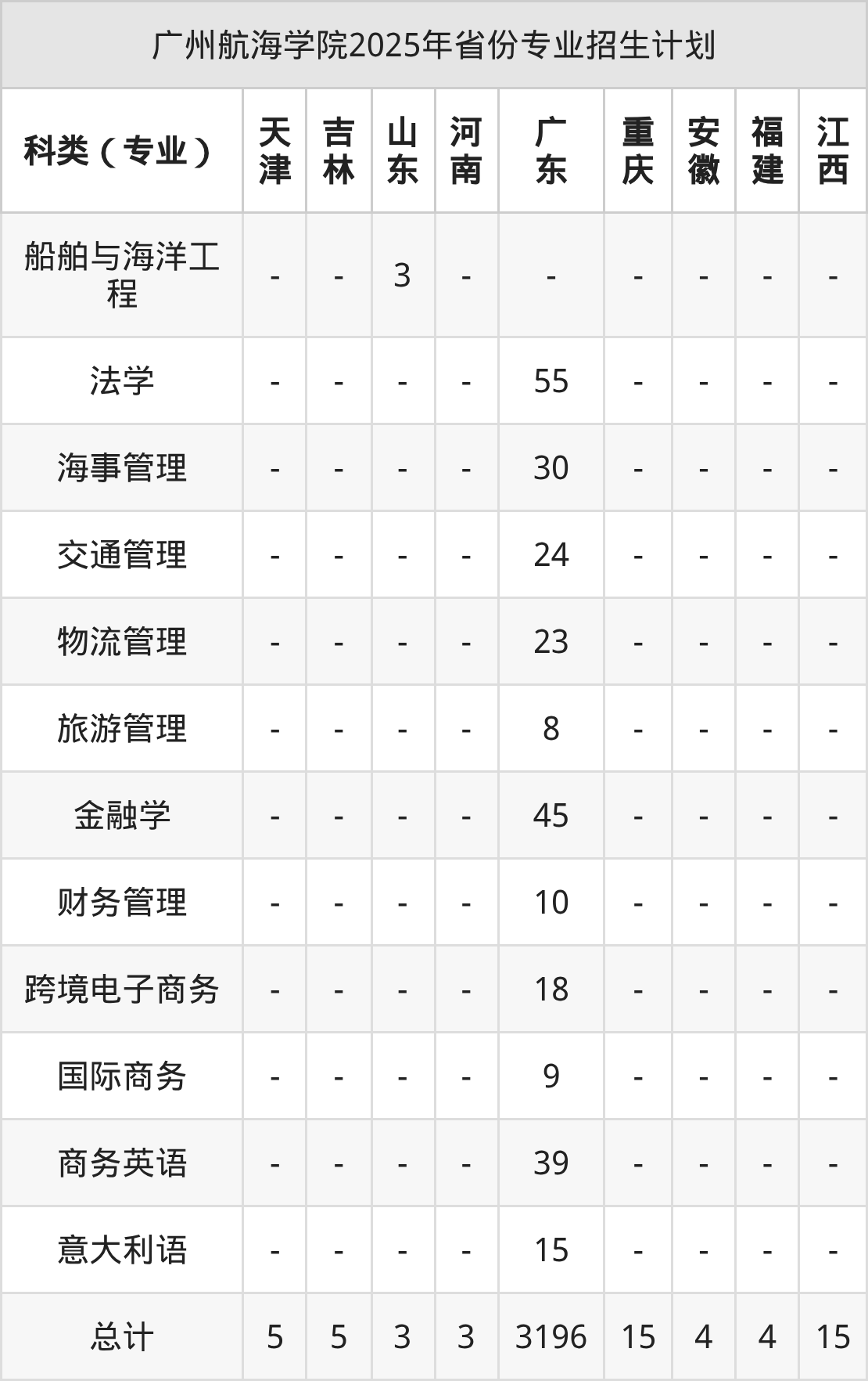 广州航海学院2026年招生简章预计在6月发布,目前同学们可以先参考2025年招生简章。信息显示,该校计划面向19个地区招收本科生3327人,其中国际商务专业20人,意大利语专业30人。