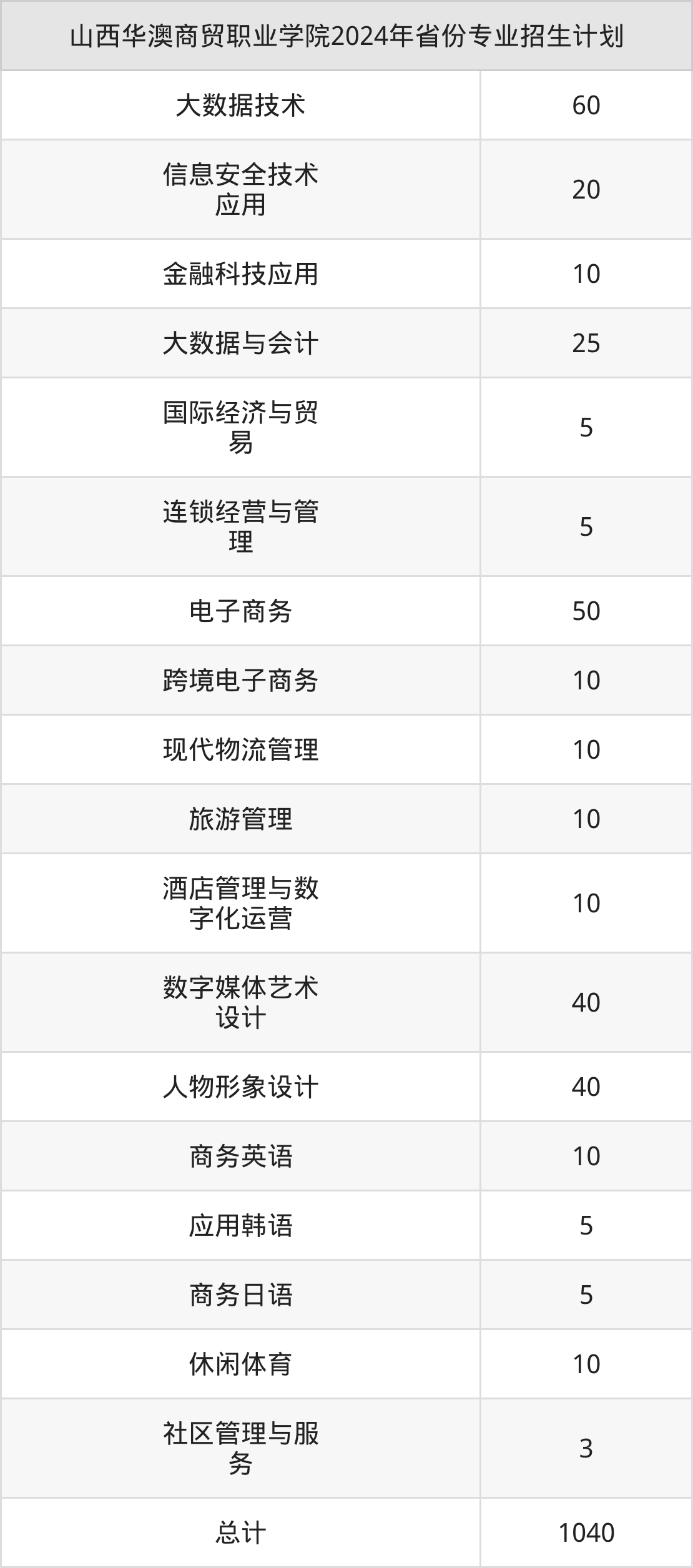 2025年山西华澳商贸职业学院专科招生计划待公布,下面附上2024年数据,暂供参考: