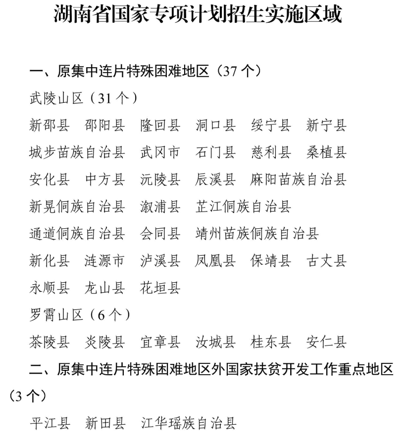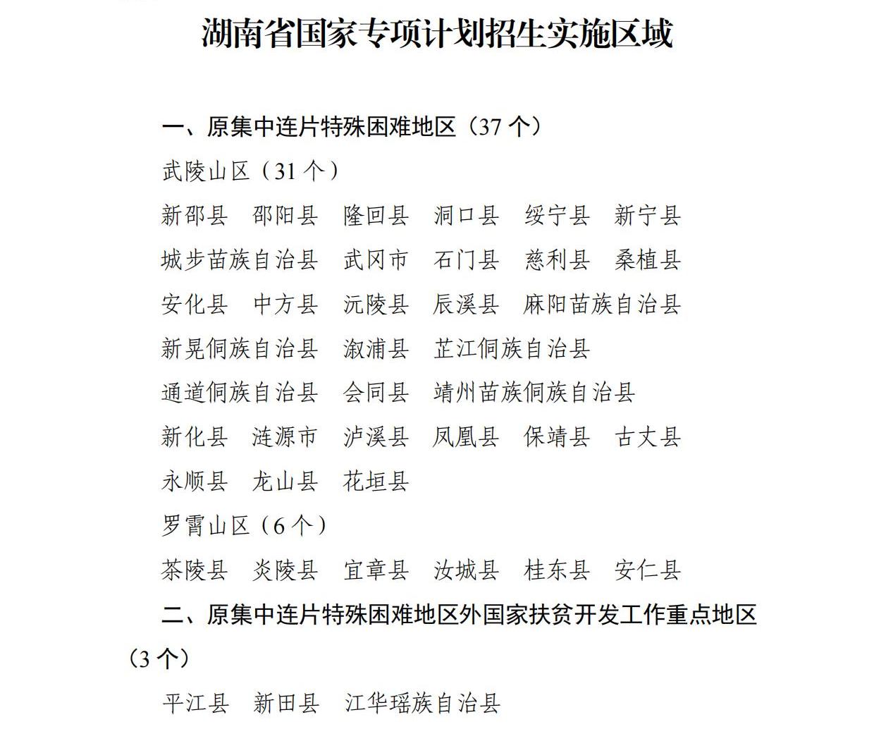 1、国家专项计划:招生实施区域为原集中连片特殊困难地区县(市)、原国家扶贫开发工作重点县,共计 40 个县(市)。