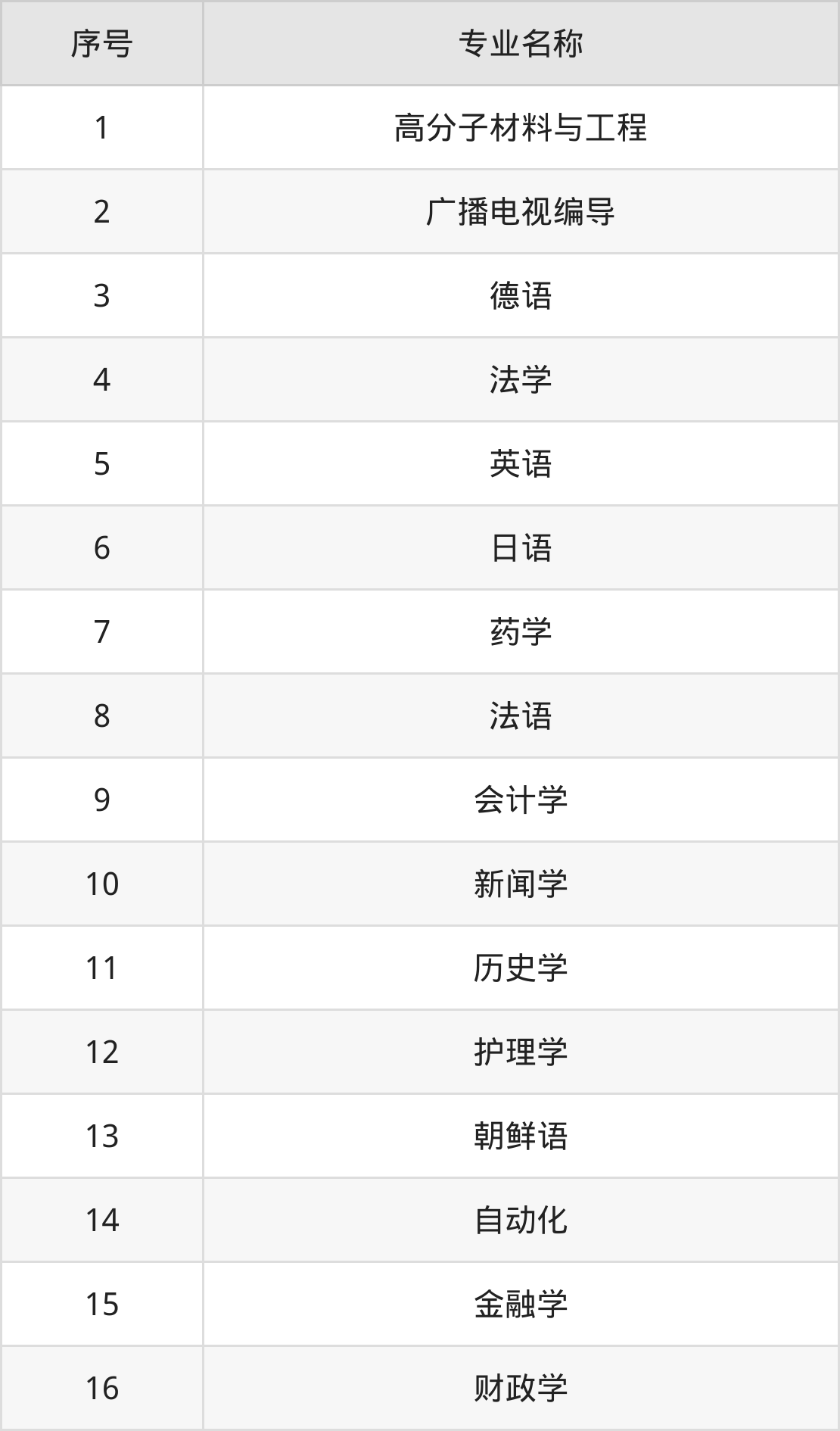 历史类(文科)本科招生专业:法学、法语、英语、日语、德语、新闻学、会计学、朝鲜语、财政学、金融学等。