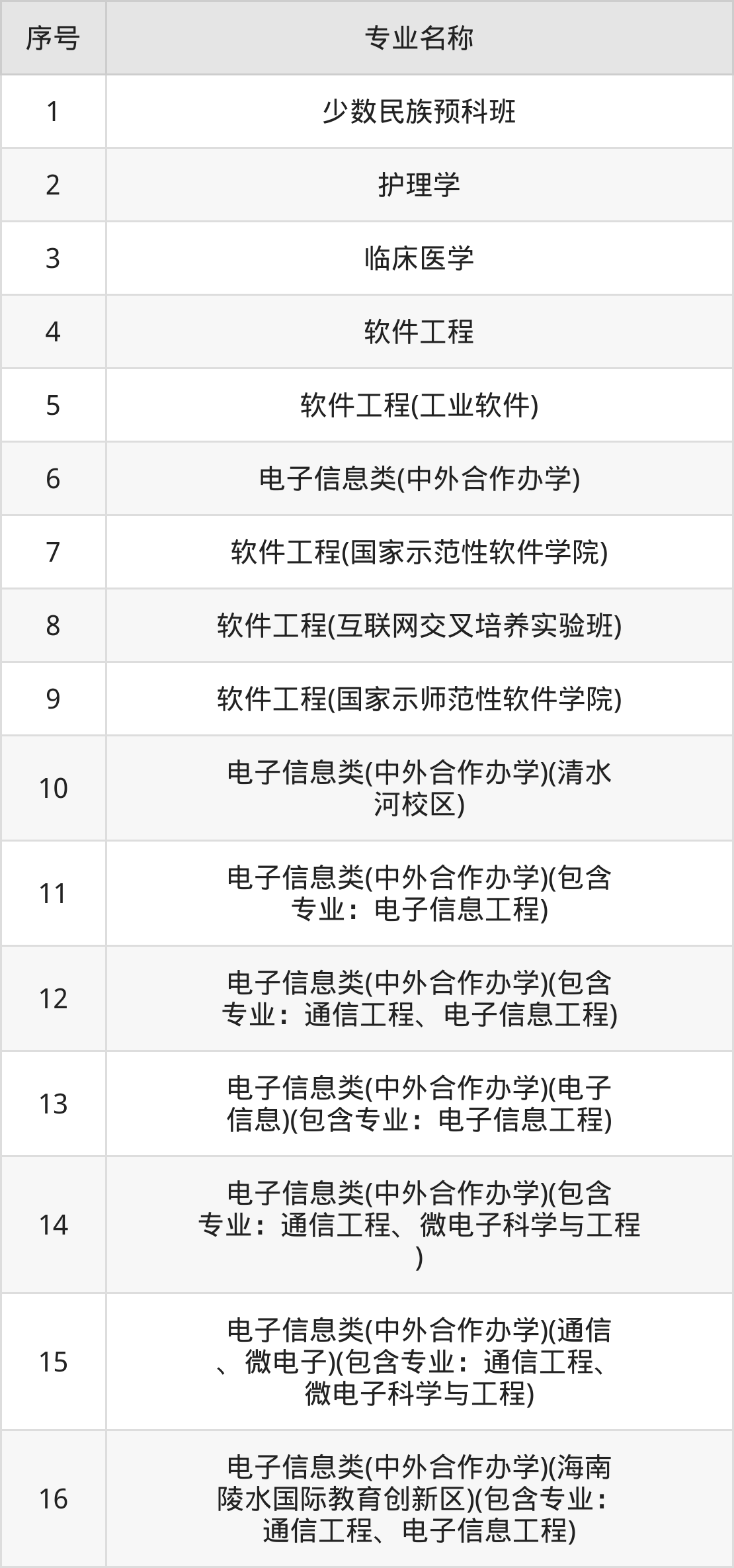 物理类(理科)本科招生专业:少数民族预科班、护理学、临床医学、软件工程(工业软件)、电子信息类(中外合作办学)、软件工程(国家示范性软件学院)、软件工程(国家示师范性软件学院)、软件工程(互联网交叉培养实验班)、电子信息类(中外合作办学)(清水河校区)、电子信息类(中外合作办学)(包含专业:电子信息工程)等。